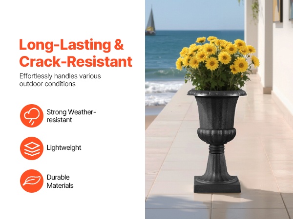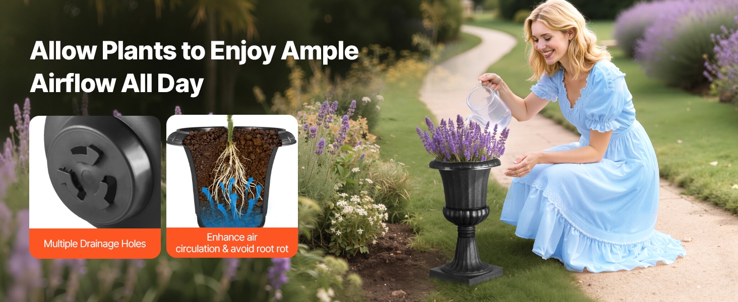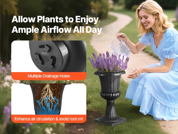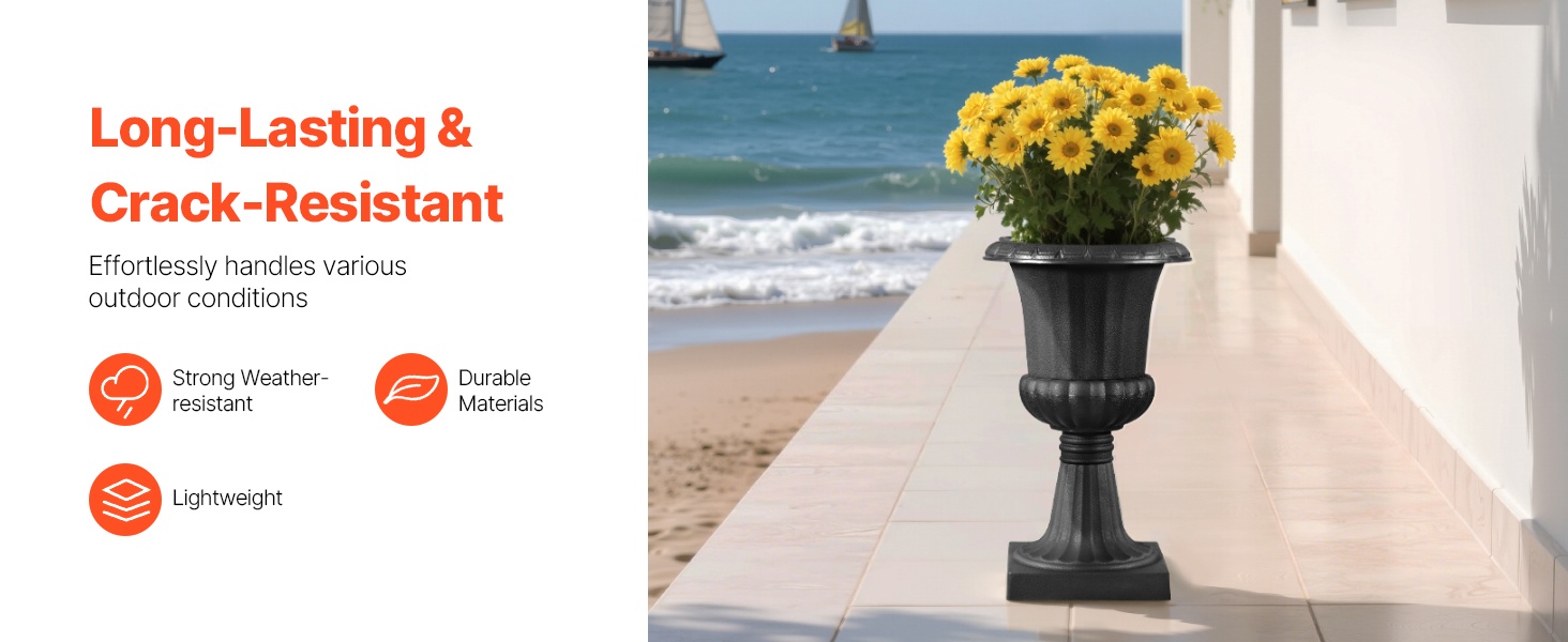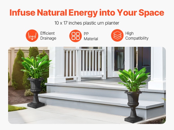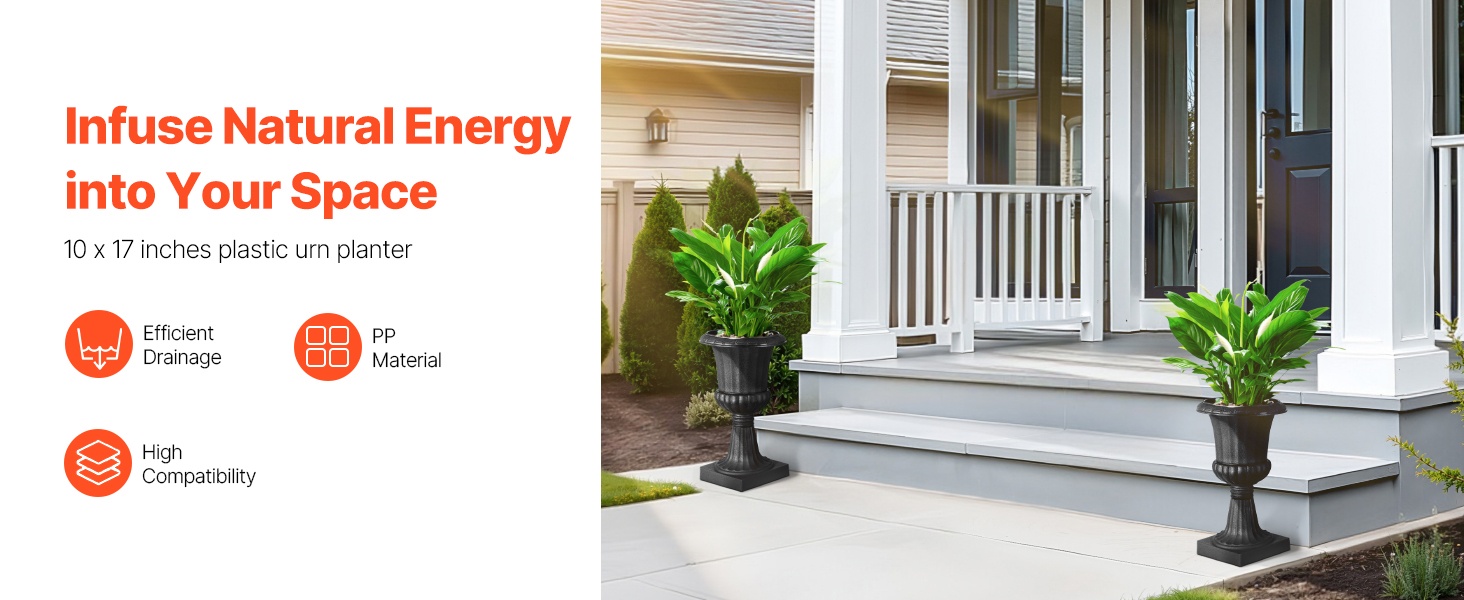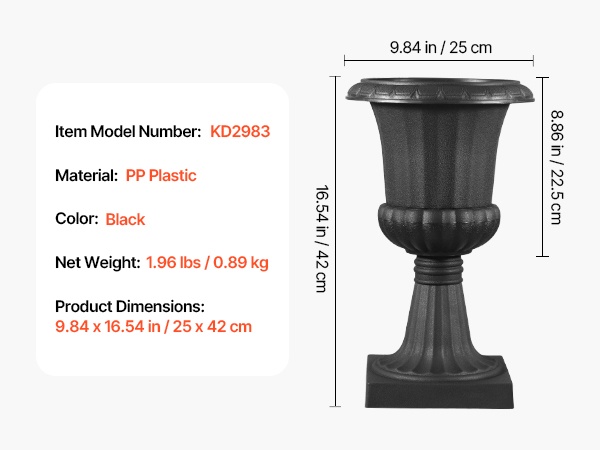 9.8 x 16.5 tuuman (noin 25 x 42 cm) muovinen jalallinen ruukku sopii monenlaisille kasveille. Kevyt ja kestävä PP-muovi sekä älykäs vedenpoistojärjestelmä tekevät ruukusta toimivan ratkaisun sekä sisä- että ulkokäyttöön, kun haluat tuoda tilaan lisää vihreyttä.