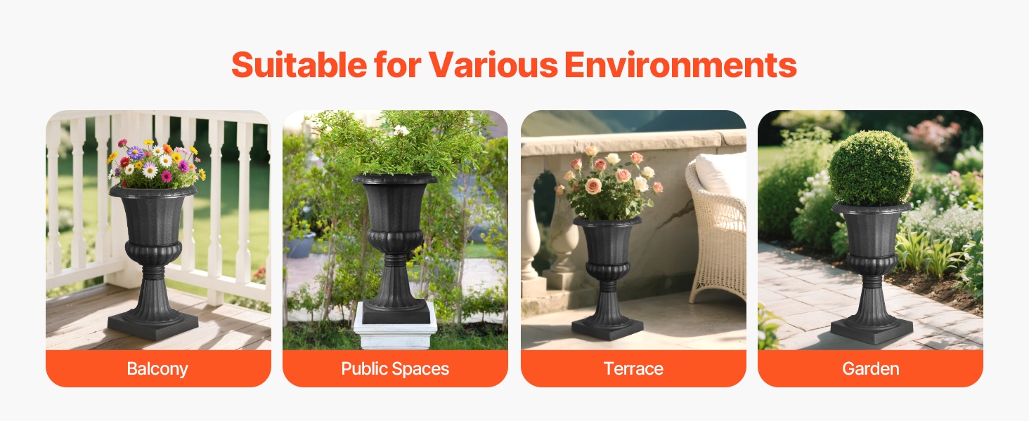 Klassinen muotoilu sopii hyvin parvekkeille, terasseille, puutarhoihin sekä erilaisiin julkisiin tiloihin. Ruukku sulautuu luontevasti ympäristöönsä ja tuo tilaan luonnonläheistä ilmettä vähällä vaivalla.