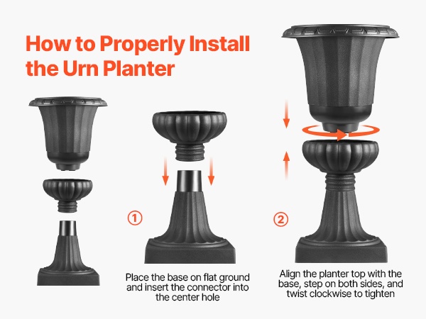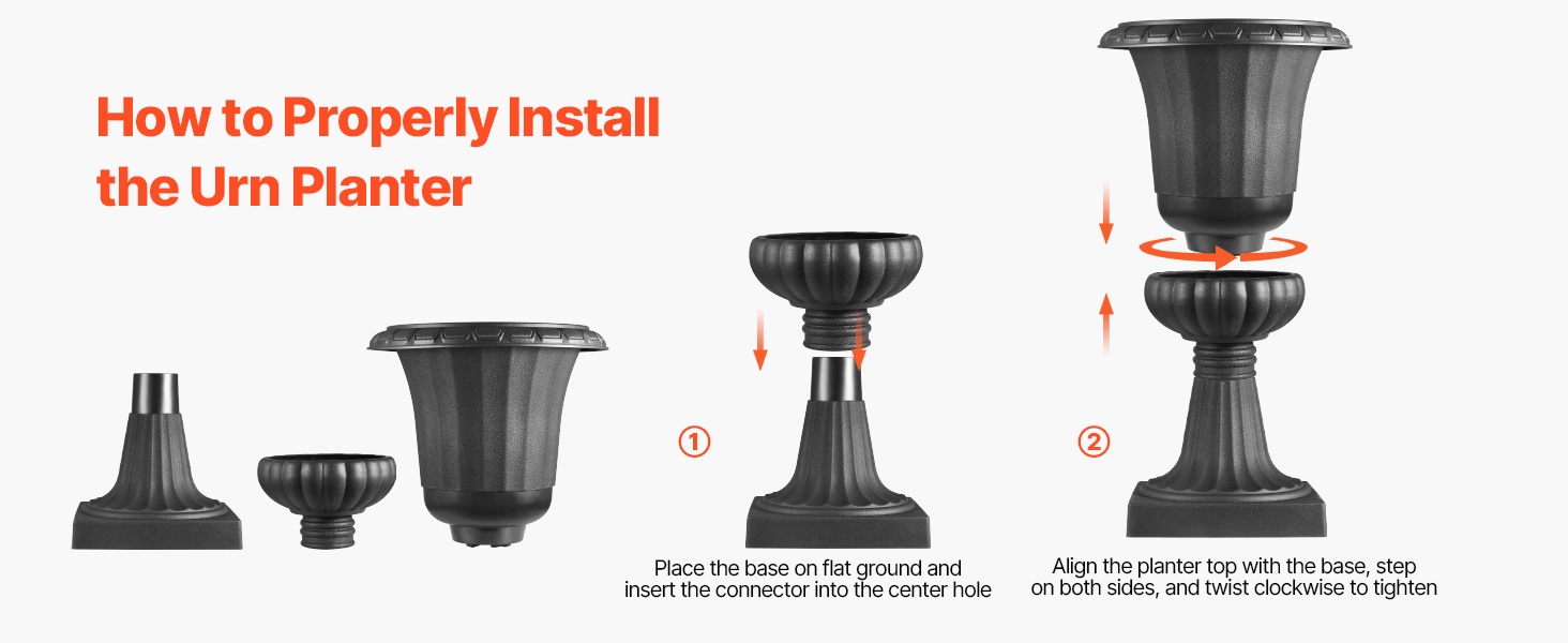 Asennukseen ei tarvita työkaluja. Aseta jalusta paikoilleen, kiinnitä liitin, sovita ruukku kohdalleen ja kierrä tiukaksi. Jalallinen ruukku on käyttövalmis muutamassa hetkessä, ja voit aloittaa istutukset heti.
