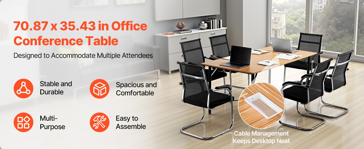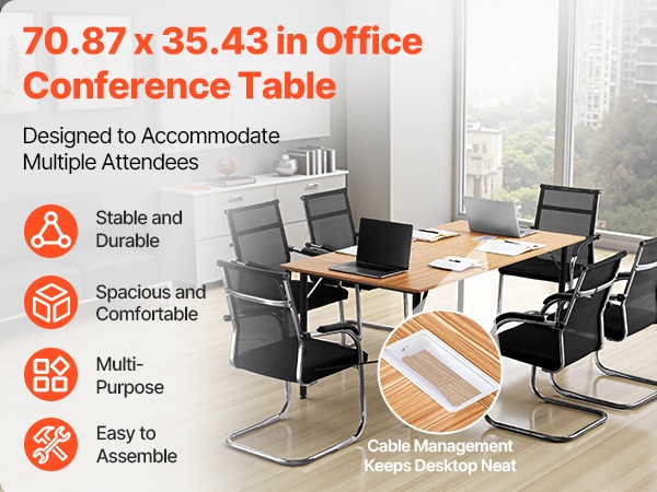 Tämä suuri neuvottelupöytä on suunniteltu kestämään käyttöä ja tarjoamaan runsaasti tilaa erilaisiin työtilanteisiin. Sisäänrakennettu kaapelinhallintajärjestelmä auttaa pitämään pöydän pinnan siistinä ja johdot järjestyksessä, mikä tukee sujuvia ja häiriöttömiä kokouksia.