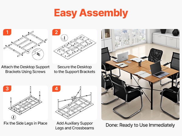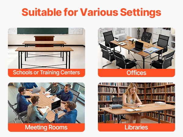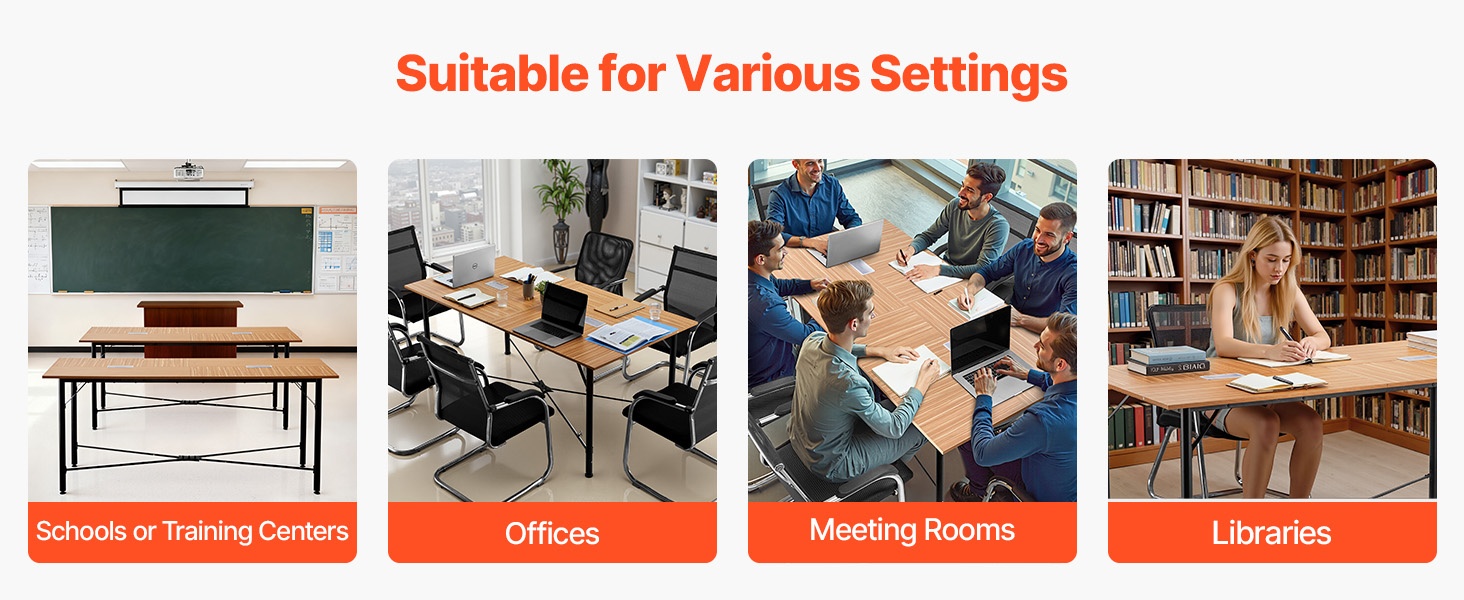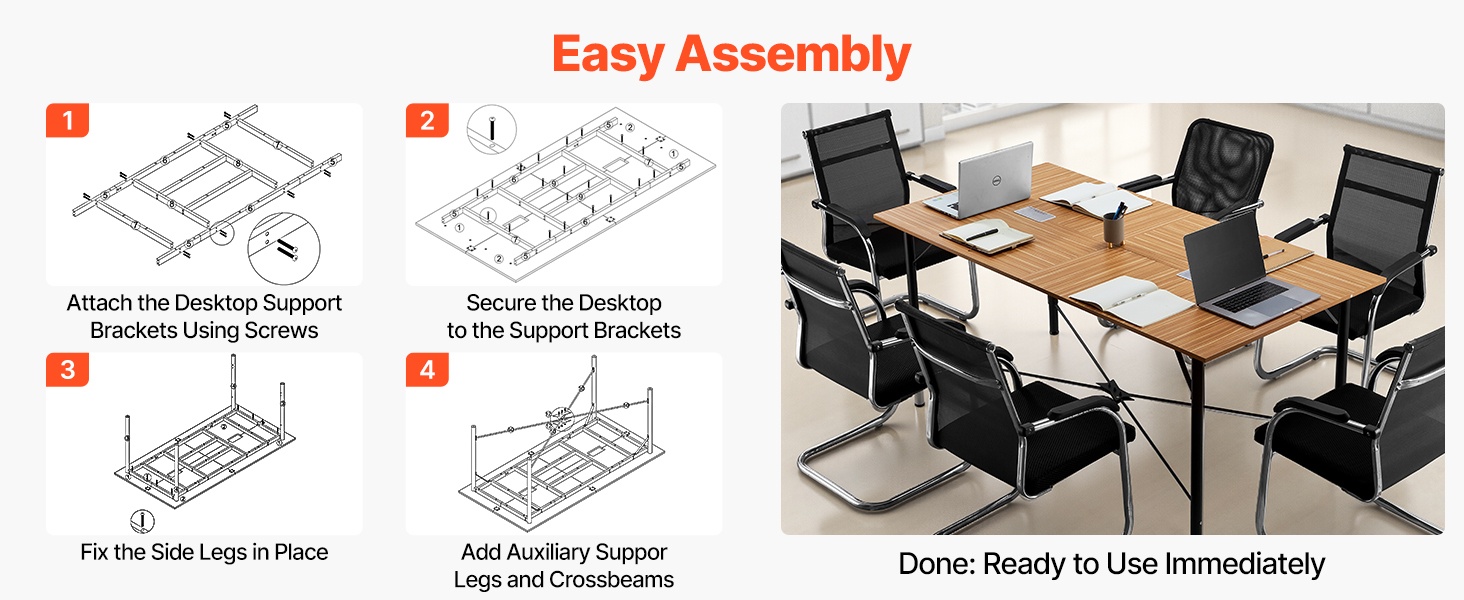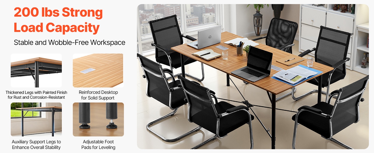 Paksunnettu pöytätaso ja vahvistetut metallijalat tarjoavat hyvän painonkeston jopa vilkkaassa käytössä. Lisätukijalat ja säädettävät jalkatassut pitävät pöydän vakaana ja vähentävät heilumista, mikä tekee siitä sopivan neuvottelu- ja koulutustiloihin.