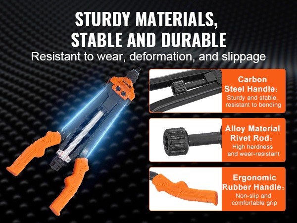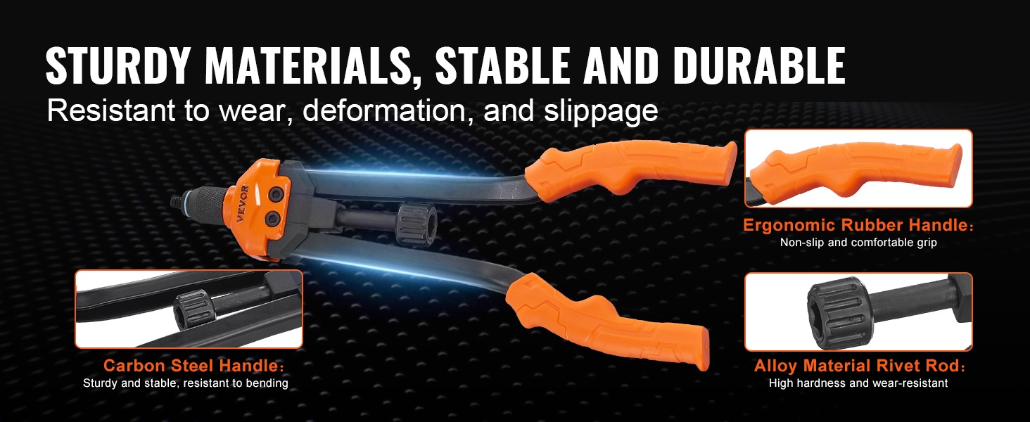 Niittimutterityökalu on suunniteltu kestävään käyttöön: korkeakovuuksinen seoksesta valmistettu niittitanko ja hiiliteräksinen kahva takaavat luotettavan ja tasaisen niittauksen. Mukava ote parantaa käyttömukavuutta myös pidemmissä työrupeamissa.