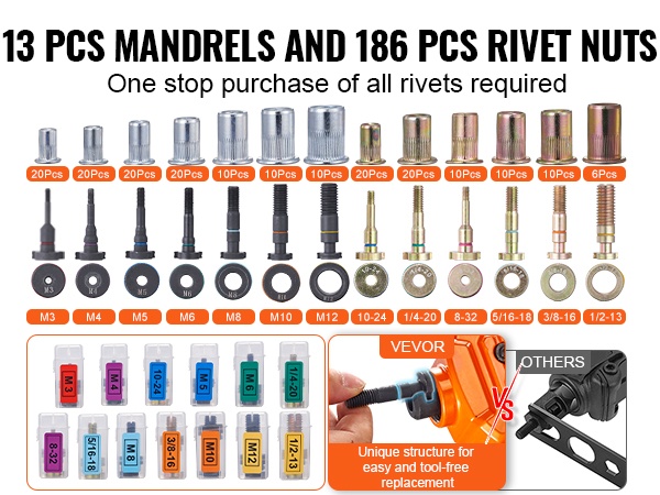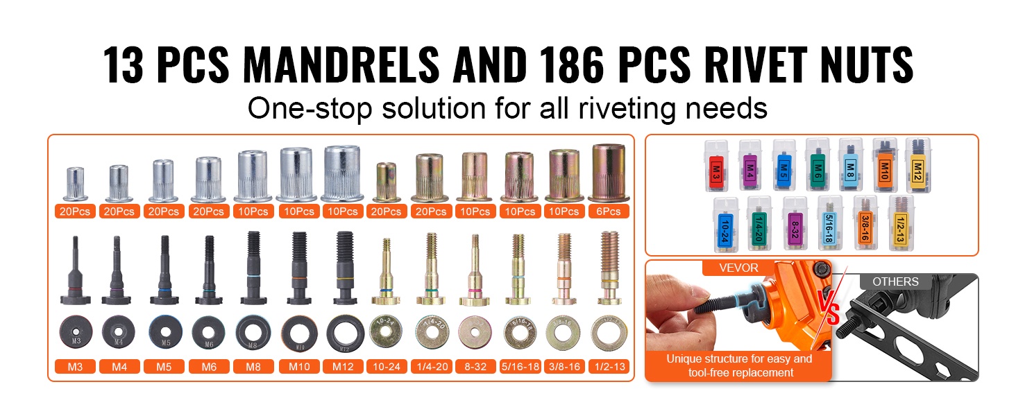 Niittimutterisarja sisältää 13 kpl kara- ja mutterisettejä, yhteensä 186 kpl niittimuttereita. Sarja soveltuu esimerkiksi metalliin, puuhun, kalustetöihin, elektroniikkaan ja moniin muihin kohteisiin. Nopea, työkaluton karan ja mutterin vaihto mahdollistaa erilaisten tehtävien hoitamisen ilman useita eri työkaluja. Kaikki tarvikkeet pysyvät järjestyksessä mukana tulevassa kantosalkussa.