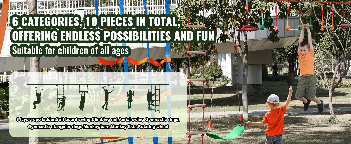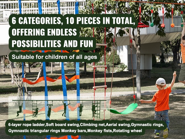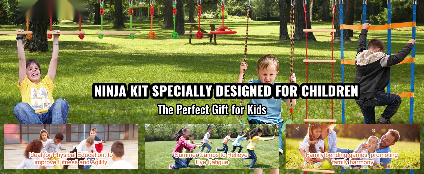 Monipuolinen ninja-ratapaketti tarjoaa lapsille hauskan ja kehittävän leikkiympäristön pihalle tai puutarhaan. Rata herättää halun haastaa itseään ja tukee myönteisen asenteen kehittymistä leikin kautta.