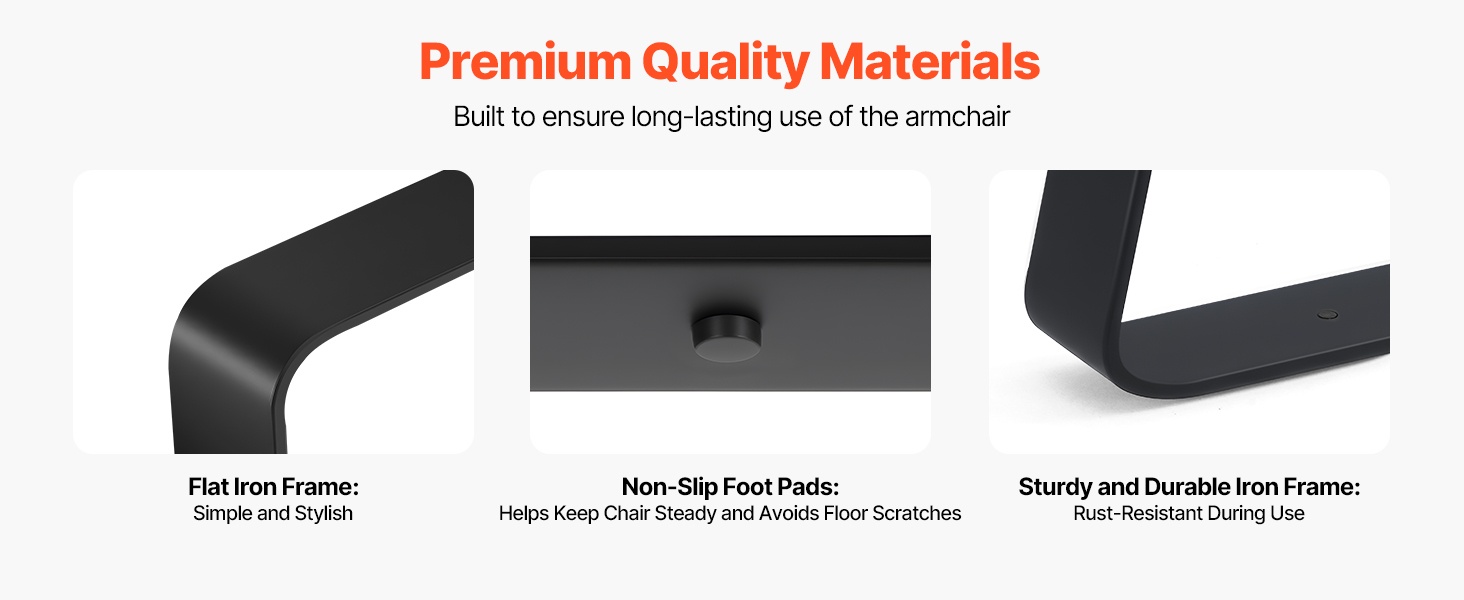 Nojatuolin runko on valmistettu kestävästä tasateräksestä, joka on suunniteltu kestämään käyttöä ilman vääntymistä. Kantavuus on jopa 300 lbs/135 kg. Jalkojen alla olevat liukuesteet parantavat vakautta ja auttavat suojaamaan lattiaa naarmuilta ja liukumilta.
