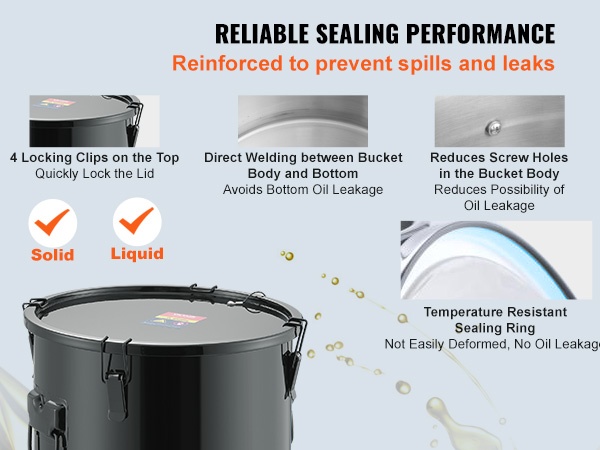 Lukitusklipsit pitävät kannen tukevasti paikoillaan ja hitsattu pohja auttaa ehkäisemään vuotoja. Näin öljy pysyy astiassa myös kuljetuksen ja kaatamisen aikana, mikä parantaa keittiön siisteyttä ja turvallisuutta.