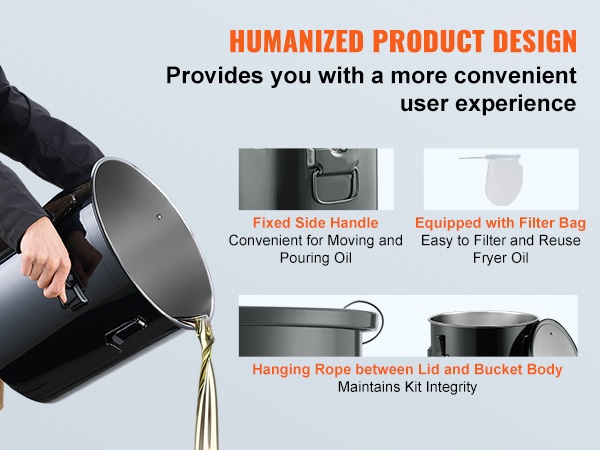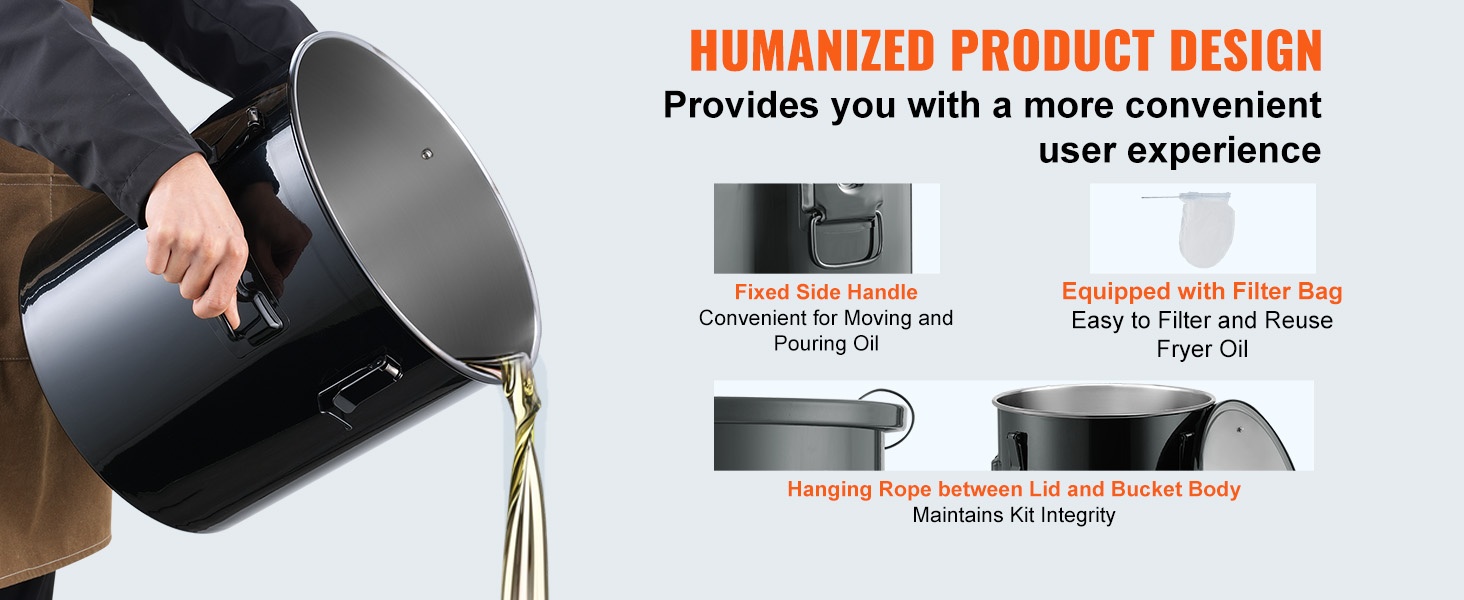 Kantokahvat helpottavat kuuman öljyastian kaatamista ja siirtämistä. Kansi on yhdistetty ämpäriin köydellä, joten se pysyy aina käden ulottuvilla eikä vie erillistä säilytystilaa. Mukana tuleva suodatinpussi helpottaa paistoöljyn puhdistamista ja mahdollistaa sen tehokkaamman hyödyntämisen.