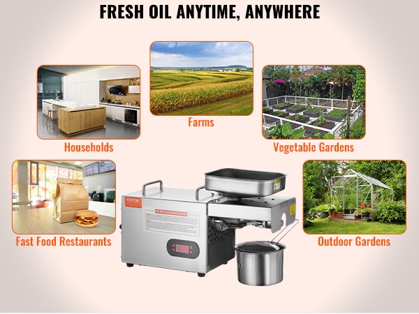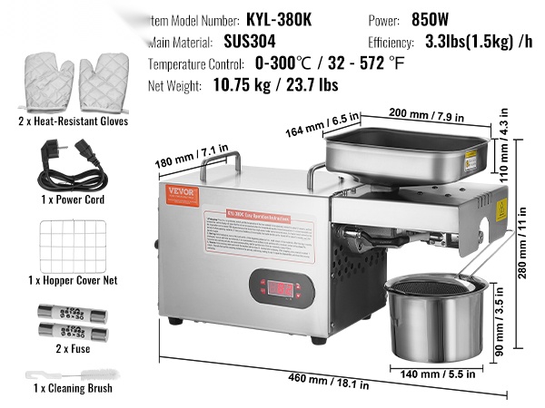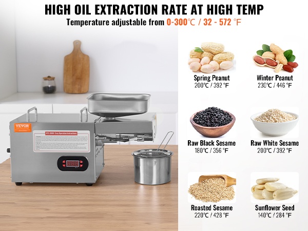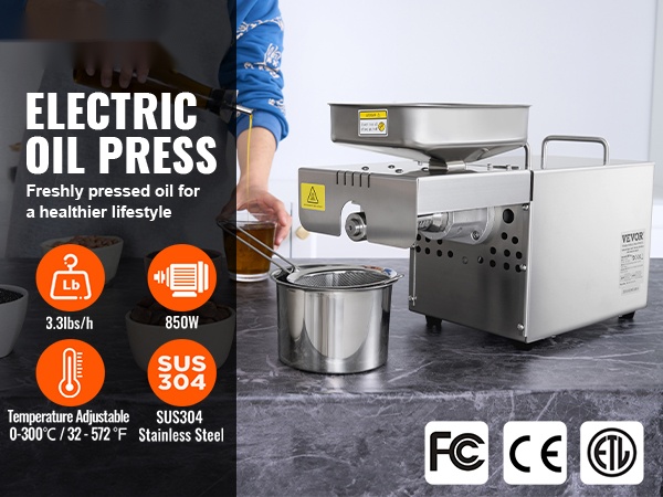 Sähköinen öljynpuristuskone auttaa puristamaan tuoretta öljyä esimerkiksi maapähkinöistä, seesaminsiemenistä, rapsista ja teensiementen kaltaisista raaka-aineista. Tehokas 850W moottori puristaa jopa 1.5kg / 3.3 paunaa tunnissa ja soveltuu yhtäjaksoiseen käyttöön jopa 24 tunnin ajan.