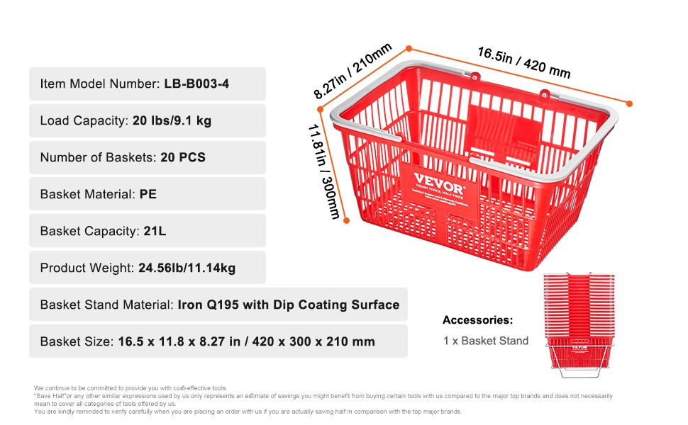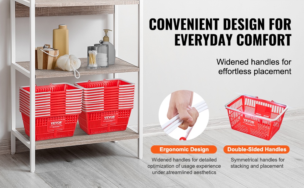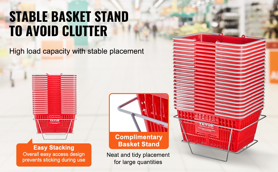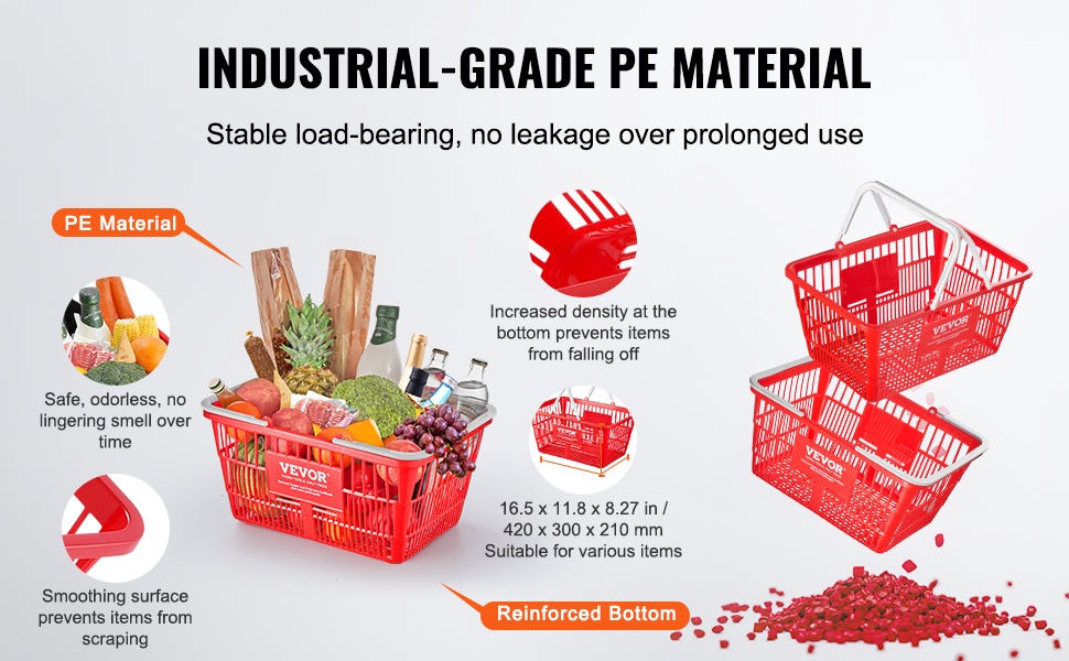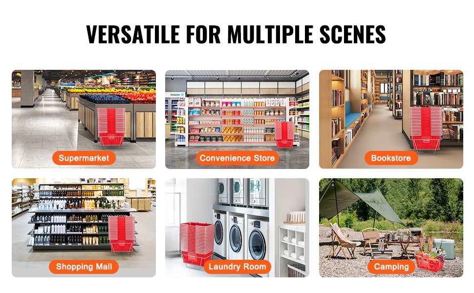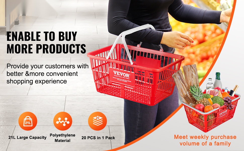 Tämä 12 kappaleen käsikäyttöinen ostoskorisetti sopii hyvin päivittäistavarakauppoihin, myymälöihin ja muihin liike- ja palvelutiloihin. Korien tilavuus on 21L, joten niihin mahtuu helposti koko perheen viikon ostokset tai pienemmät täydennysostokset.