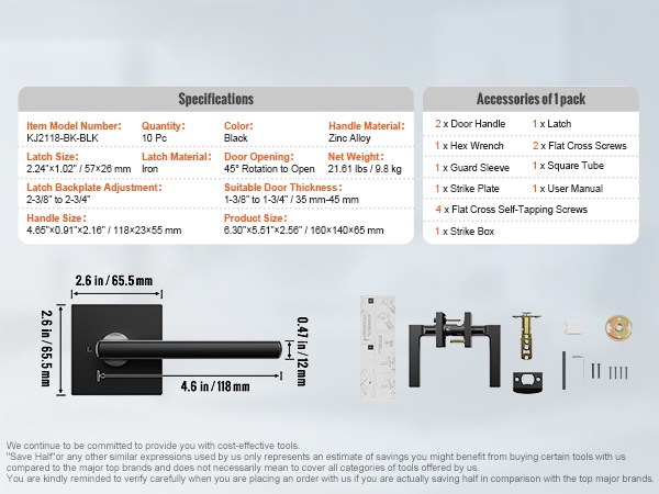 Matta musta ovenpainike tarjoaa yksityisyydensuojan lisäksi siistin ja ajattoman ulkonäön. Teljen säätömahdollisuus (2-3/8" tai 2-3/4") helpottaa sovittamista olemassa oleviin ovirunkoihin.