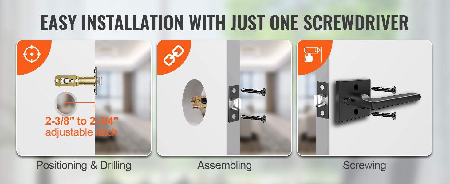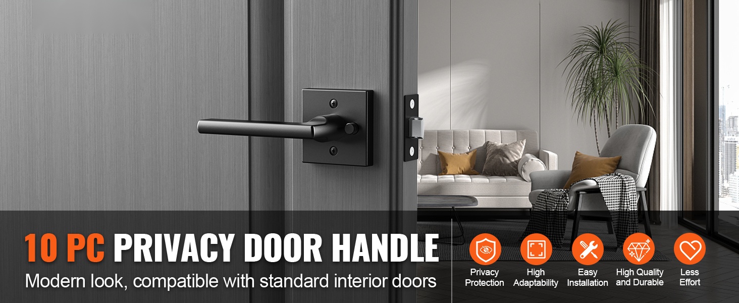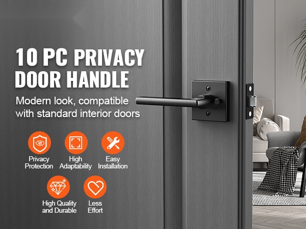Tämä mattamusta ovenpainike on varustettu lukitustoiminnolla, joka suojaa yksityisyyttä esimerkiksi makuuhuoneen ja kylpyhuoneen ovissa. Mukana tulee säädettävä telki, jota voidaan käyttää joko 2-3/8" tai 2-3/4" (60 mm / 70 mm vaihdettavissa) syvyyden kanssa. Soveltuu oviin, joiden paksuus on 1-3/8"–1-3/4" (35–45 mm), ja se on yhteensopiva yli 95 % sisäovista.