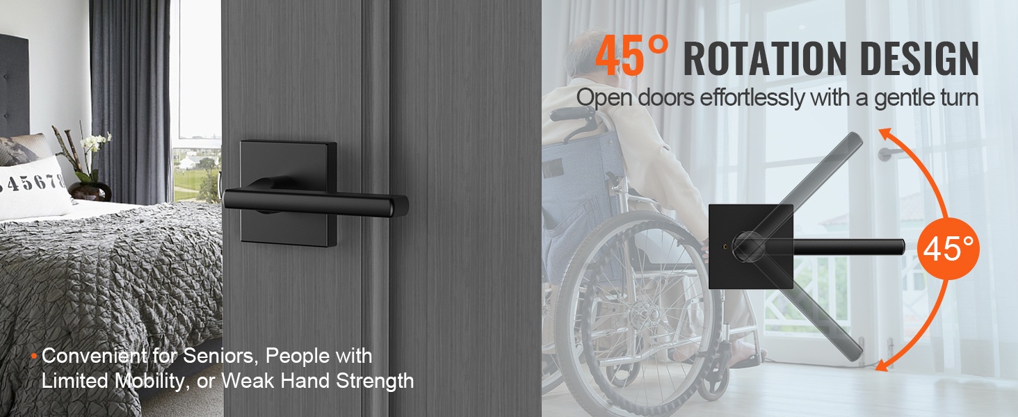 45° kääntyvä kahva vaatii vähemmän voimaa kuin perinteiset 90° kahvat. Tämä helpottaa oven käyttöä erityisesti ikääntyneille, henkilöille, joilla on heikompi puristusvoima, sekä niille, joilla on liikerajoitteita.