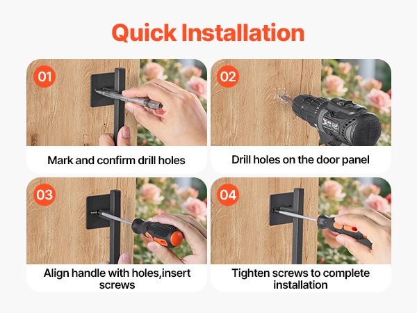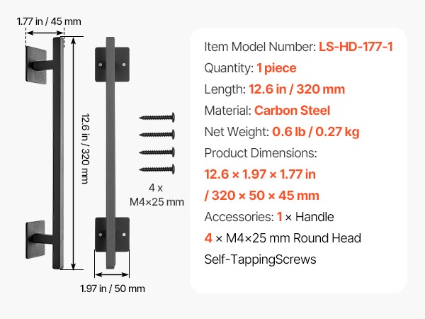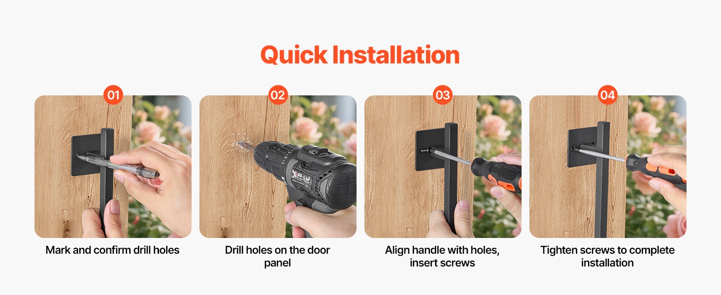 Mukana toimitetaan tarvittavat ruuvit ja kiinnitystarvikkeet, jotta kahvan saa asennettua nopeasti ja vaivattomasti. Selkeä rakenne helpottaa kiinnitystä erilaisiin oviin ja portteihin.