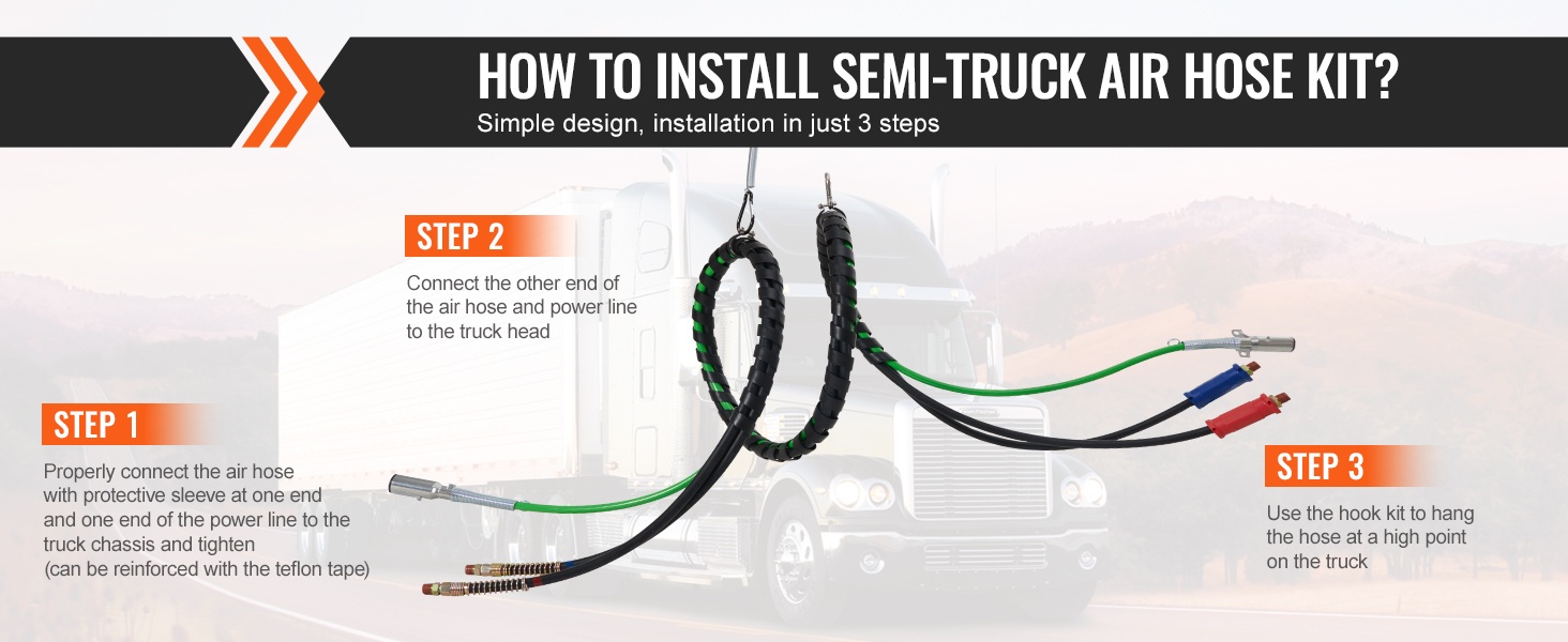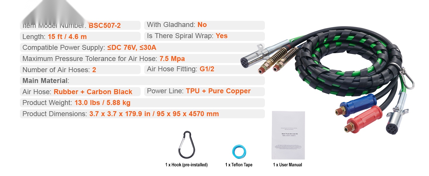 15FT 3-in-1 paineilmaletkusarja kuorma-autolle helpottaa perävaunun ilman- ja sähköjärjestelmän ylläpitoa. Sarja sopii kuluneiden ABS-järjestelmän ilma- ja virtalinjojen vaihtoon ja tarjoaa selkeän, siistin letkuvedon vetoauton ja perävaunun välille.