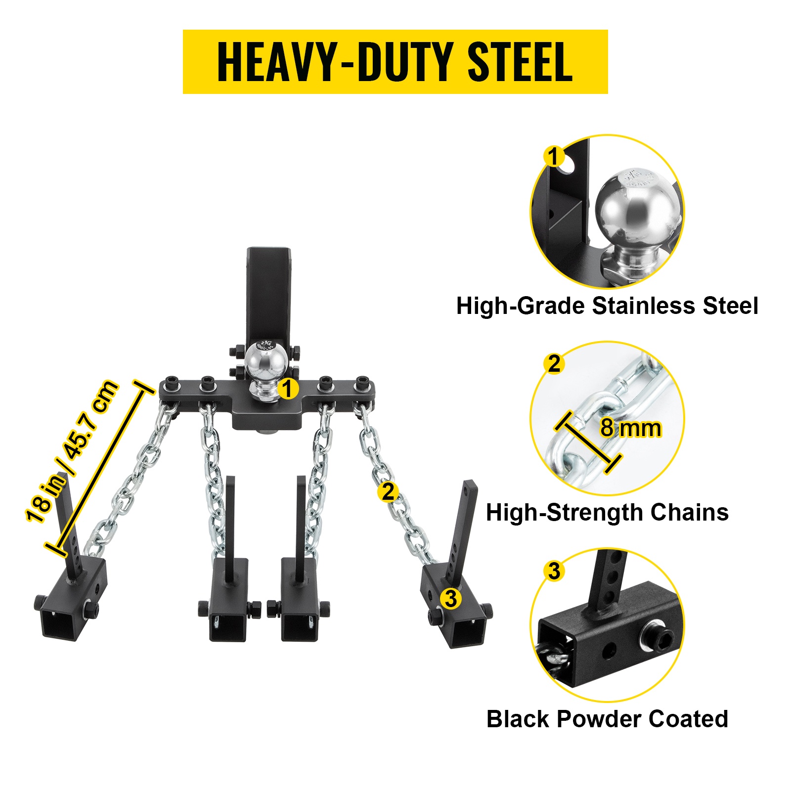 Vakio 2" vetokuula ja heilunnanvaimennusketjut on kiinnitetty säädettävään kuula-adapteriin. Asennuskorkeutta voidaan säätää tarpeen mukaan, ja säätövara on 4" / 10,2 cm.