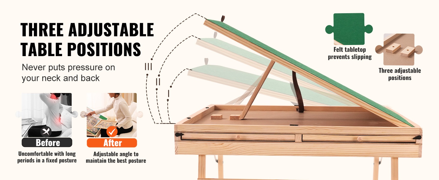 Kolmiportaisesti kallistettava pöytälevy on suunniteltu ergonomian mukaan, jotta palapelien ystävät löytävät mukavan työasennon. Huopapäällysteinen työskentelyalusta pitää palat paremmin paikoillaan, eikä niitä pääse putoamaan pöydän kallistuessa.
