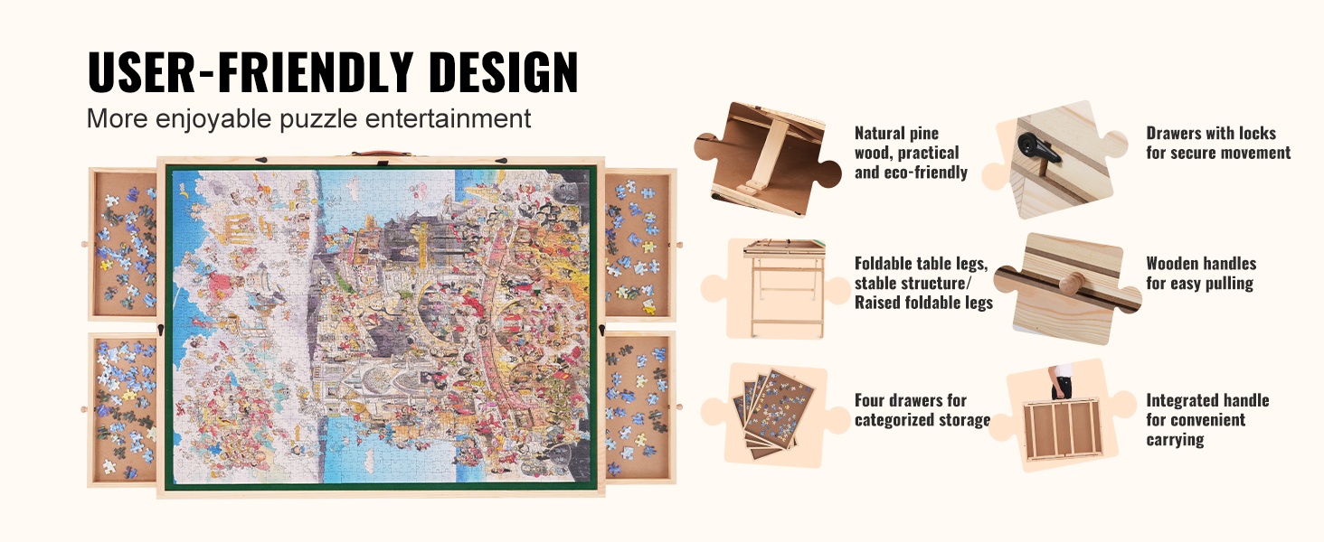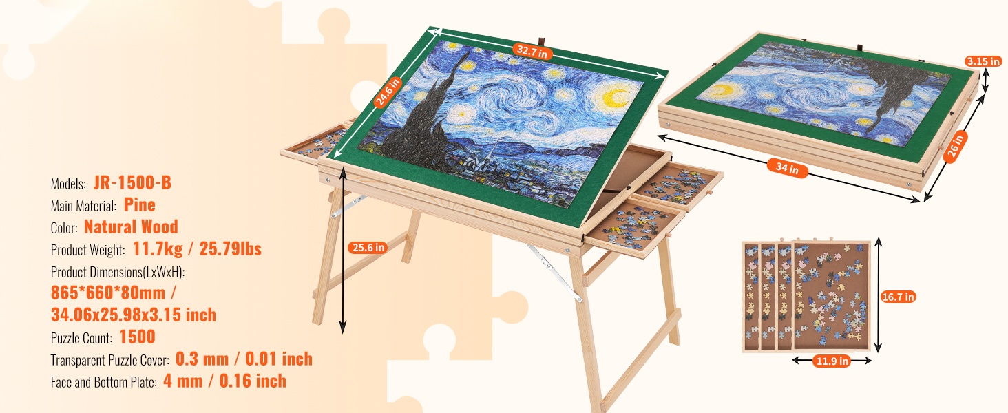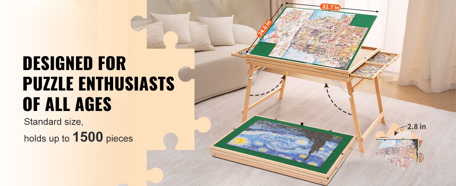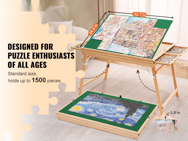 Palapelipöytä mäntyinen 1500 palan kolmiportaisesti kallistettava neljä laatikkoa läpinäkyvä kansi