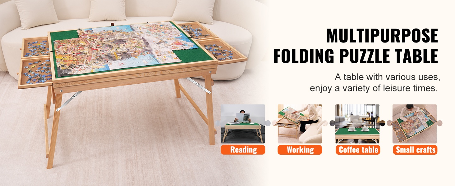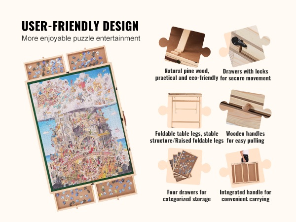 Tämä palapelipöytä on mitoitettu jopa 1500 palan palapeleille ja tarjoaa selkeän, rajatun työskentelytilan. Monikäyttöinen rakenne helpottaa palapelin kokoamista ja auttaa pitämään palat järjestyksessä myös silloin, kun teet muita arkiaskareita.