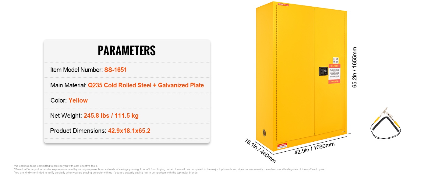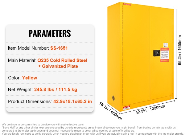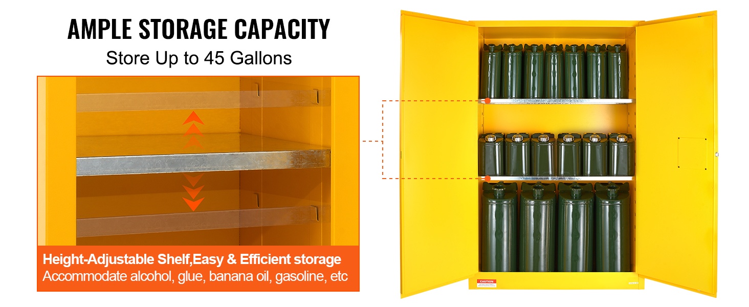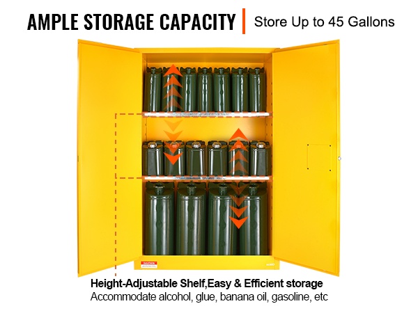 Kaapin tilavuus on 34 gallonaa, joten se soveltuu monenlaisten palavien ja helposti syttyvien aineiden säilytykseen, kuten alkoholit, liimat, banaaniöljy, bensiini ja vastaavat kemikaalit. Kaapissa on 1 säädettävä hylly, jonka korkeutta voi muuttaa säilytystarpeen mukaan.