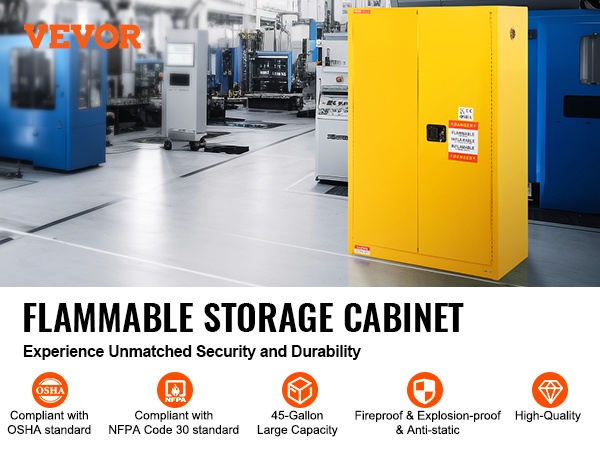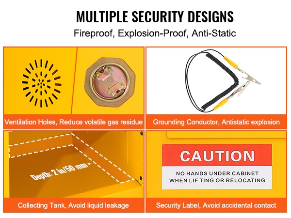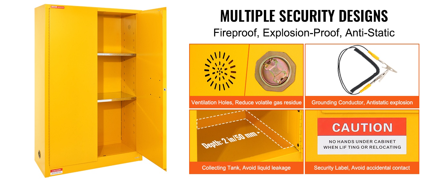 Kaappi on valmistettu Q235-kylmävalssatusta teräksestä, mikä takaa tukevuuden ja pitkän käyttöiän. Ilmanvaihtoaukot auttavat ehkäisemään haihtuvien höyryjen kertymistä kaapin sisälle. Mukana oleva maadoitusjohdin vähentää staattisen sähkön purkausten riskiä, jotka voisivat sytyttää höyryt.