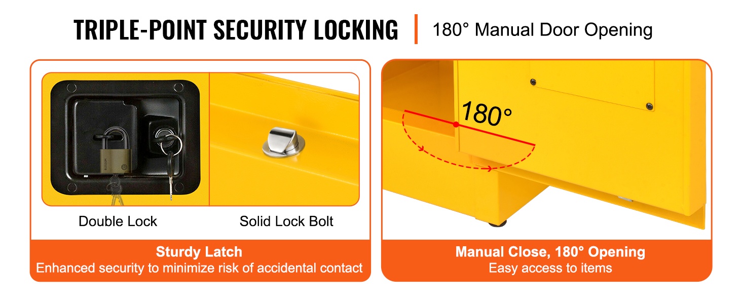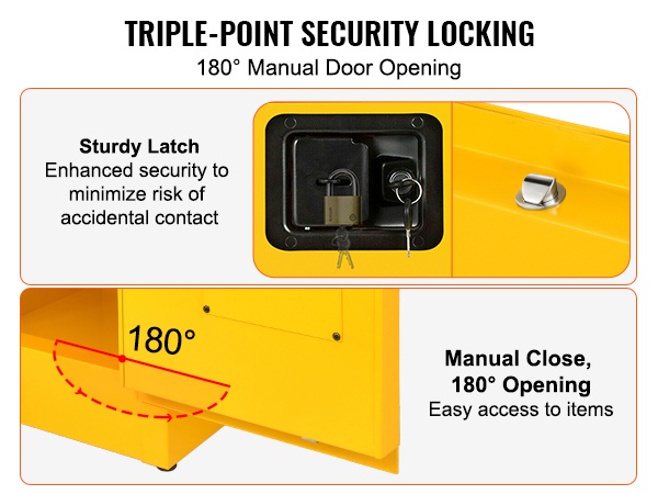 Ovet on varustettu turvallisella kolmipisteisellä avainlukitusmekanismilla, joka auttaa estämään luvattoman käytön ja vähentää vaaratilanteiden riskiä. Kaksiosainen ovi voidaan avata käsin jopa 180° kulmaan, mikä helpottaa tuotteiden lastaamista ja purkamista.