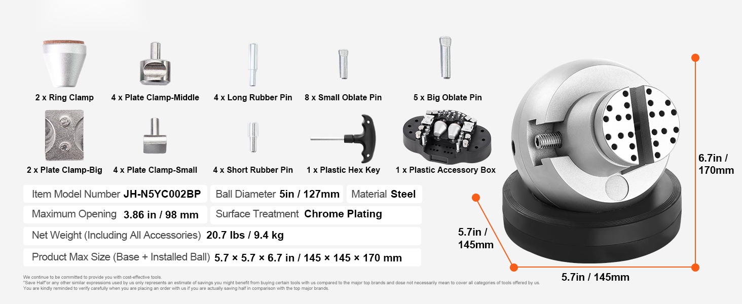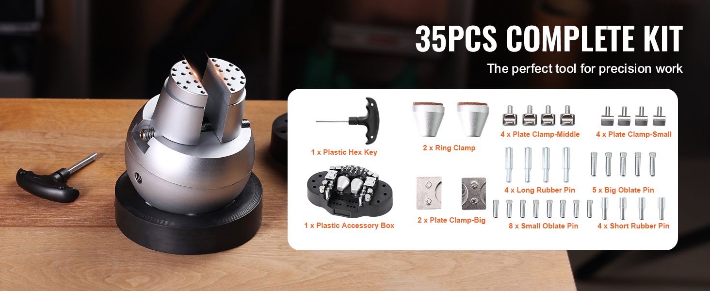 - Monipuolinen lisävarustesarja eri kokoisten ja muotoisten kappaleiden kiinnitykseen.