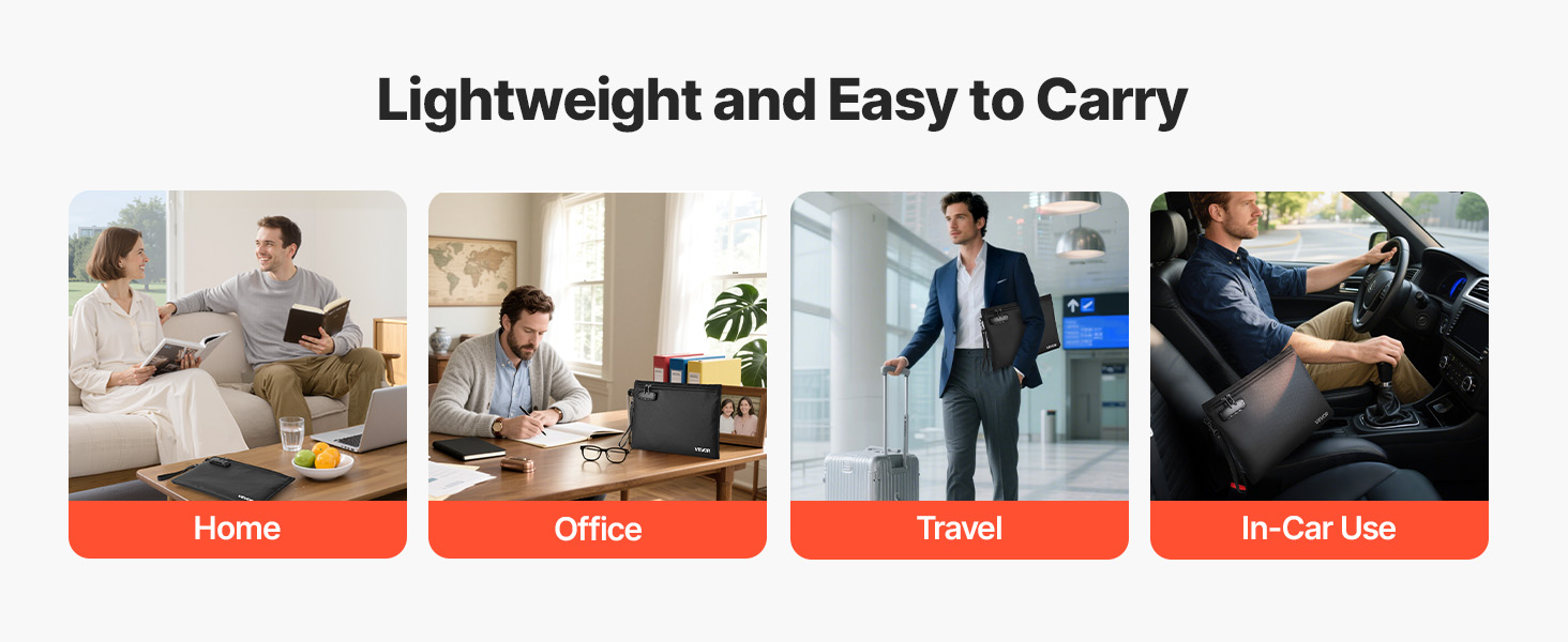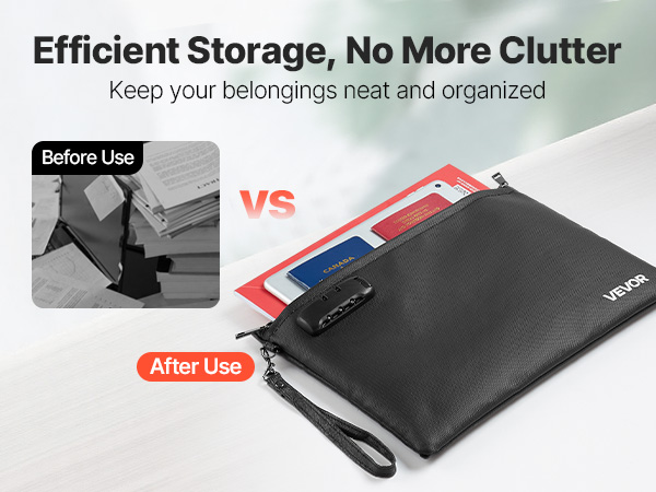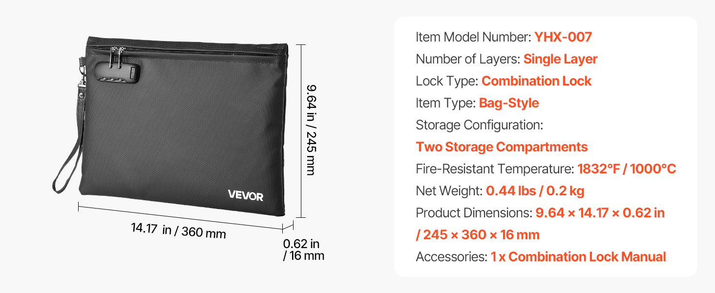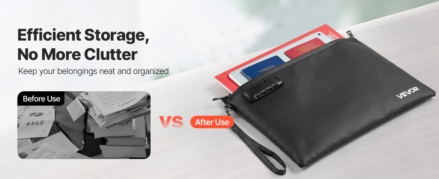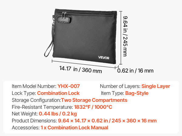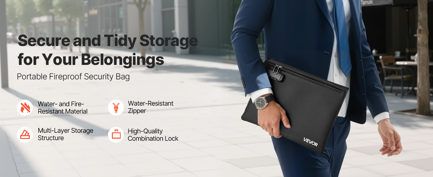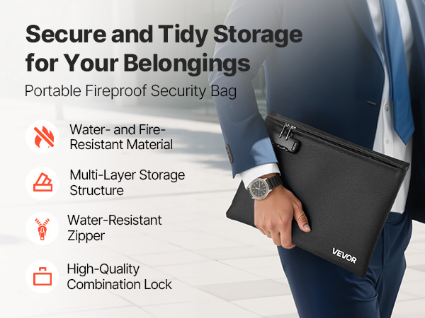 Kevyt ja helposti mukana kulkeva paloturvallinen asiakirjakansio suojaa tärkeitä papereita ja laitteita lämmöltä, vedeltä ja pölyltä. Kansiolla on 1832℉ / 1000℃ palonkestävyys, ja siinä on yhdistelmälukko sekä vesitiivis vetoketju lisäturvaa varten.