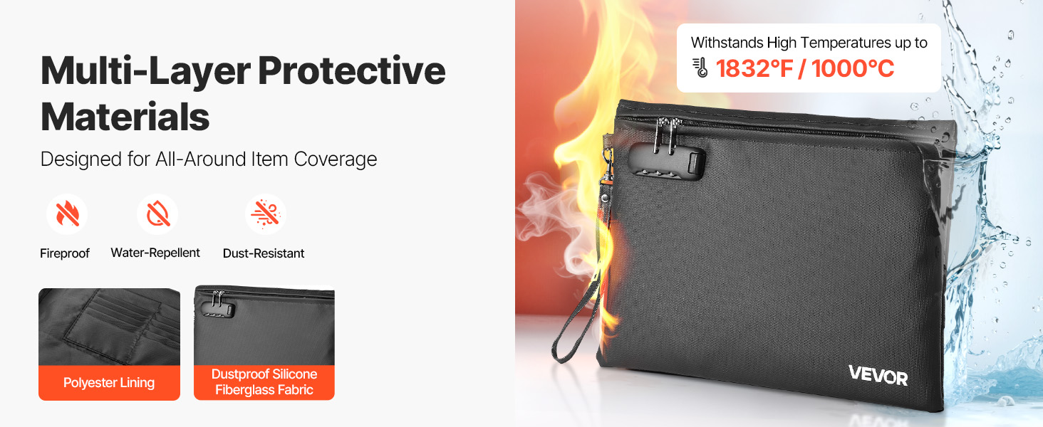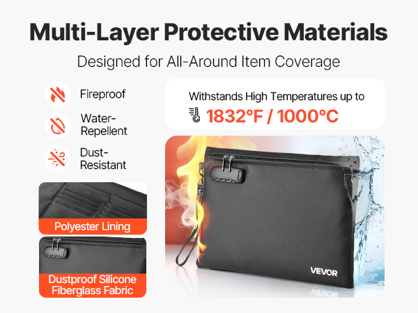 Kansio on valmistettu pölyä hylkivästä silikonipäällystetystä lasikuitukankaasta ja polyesterivuorista, jotka kestävät jopa 1832℉ / 1000℃. Tuli, rankkasade tai arjen pöly eivät pääse vahingoittamaan sisällä säilytettäviä asiakirjoja ja laitteita.