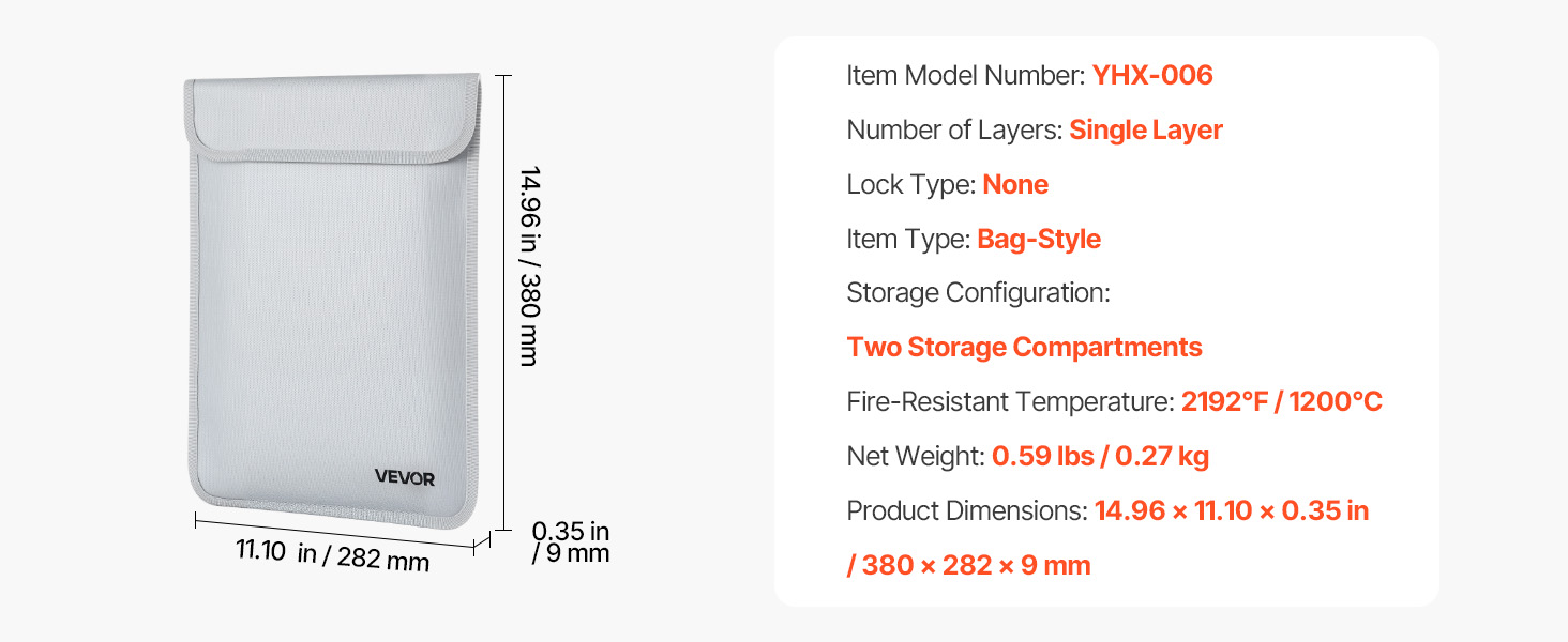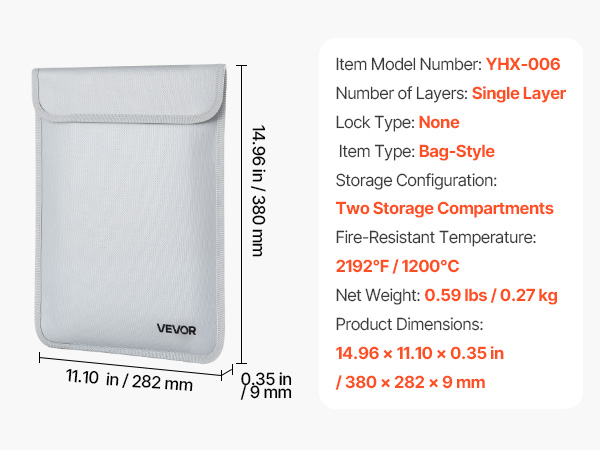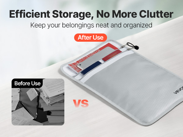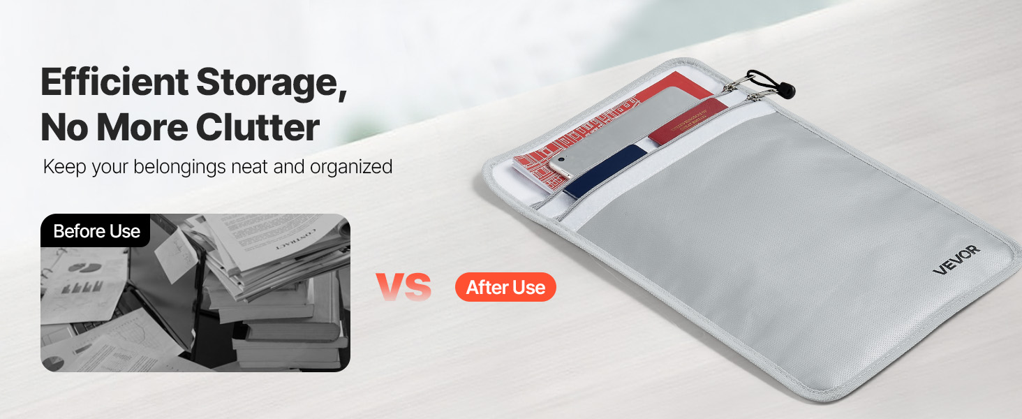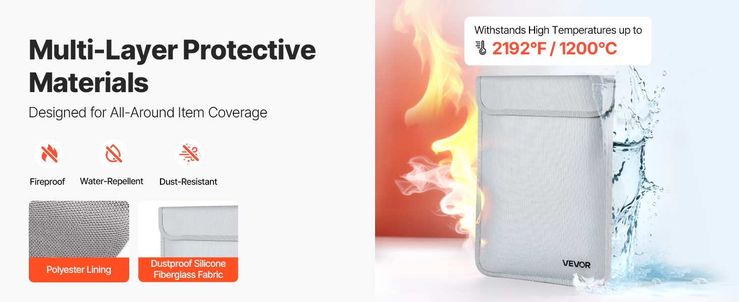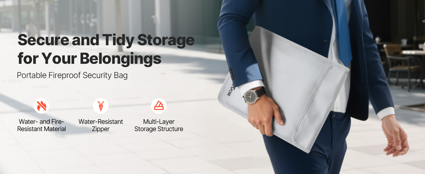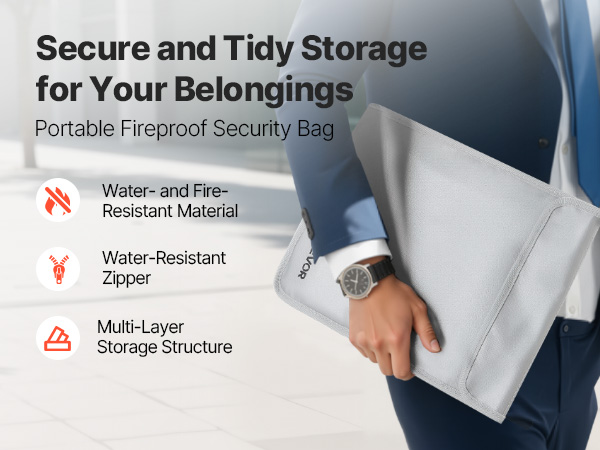 Palonkestävä asiakirjalaukku suojaa tärkeitä asiakirjoja ja arvoesineitä tulen, veden ja pölyn varalta. Laukku kestää jopa 2192℉/1200℃ lämpötilan ja on kevyt, vain 0.27 kg. Kahden erillisen säilytyslokeron ansiosta sekä asiakirjat että pienet laitteet pysyvät hyvässä järjestyksessä kotona, toimistossa ja matkalla.