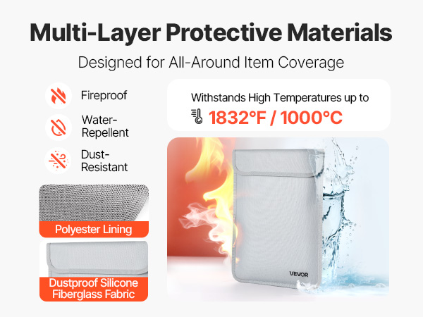 Laukku on valmistettu pölyä hylkivästä silikonipinnasta, lasikuidusta ja alumiinifoliolla päällystetystä lasikuidusta. Tämä yhdistelmä auttaa suojaamaan sisältöä äkillisissä tulitilanteissa sekä sateelta ja pölyltä jokapäiväisessä käytössä.