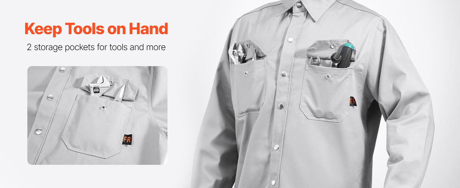 Takin hihansuut ovat säädettävät, metalliset nepparit kestävät käyttöä ja 2 käytännöllistä taskua tarjoavat tilaa tärkeimmille työkaluille ja pientarvikkeille.
