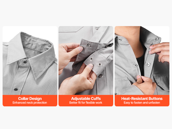 Huolella muotoiltu kaulus suojaa kaulaa paremmin kipinöiltä ja lämmöltä. Säädettävät hihansuut takaavat hyvän istuvuuden ja liikkumisvapauden. Vahvat metalliset nepparit tekevät takin pukemisesta ja riisumisesta nopeaa ja vaivatonta.