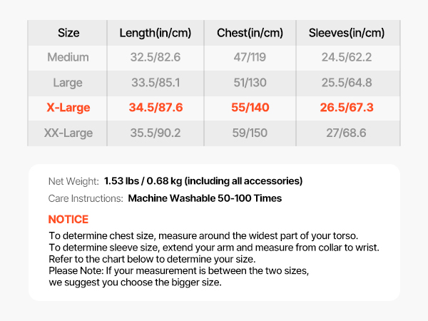 Koko on XL; rinnan leveys 55 in, hihan pituus 26,5 in ja takin kokonaispituus 34,5 in.