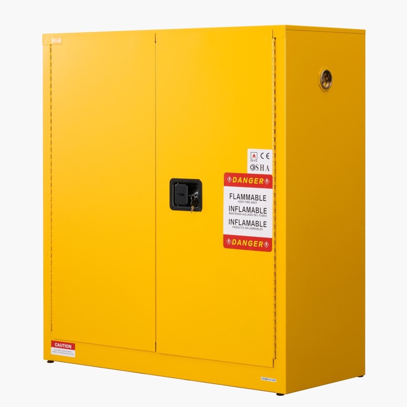 Palavien nesteiden ja kemikaalien turvalliseen säilytykseen tarkoitettu teräksinen paloturvakaappi. Kaapin runko on kylmävalssattua ja galvanoitua terästä, ja siinä on säädettävä hylly, maadoitusliitin sekä tukevat metallisaranat. Sopii teolliseen, kaupalliseen ja kotikäyttöön, kun halutaan vähentää paloriskiä ja pitää vaaralliset aineet hallitusti yhdessä paikassa.