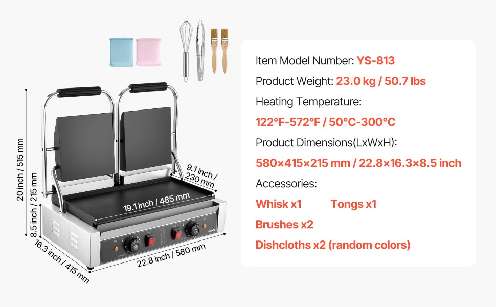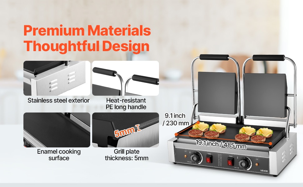- Teho: 1800W sähköinen panini- ja voileipägrilli tehokkaaseen käyttöön
