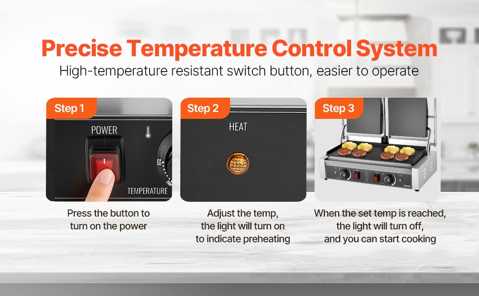 Paninigrillissä on portaattomasti säädettävä termostaatti, jonka lämpötila-alue on 122°F–572°F / 50°C–300°C. Lämpötilan voi asettaa helposti eri raaka-aineille ja kypsyysasteille sopivaksi, mikä helpottaa erilaisten ruokien valmistusta.