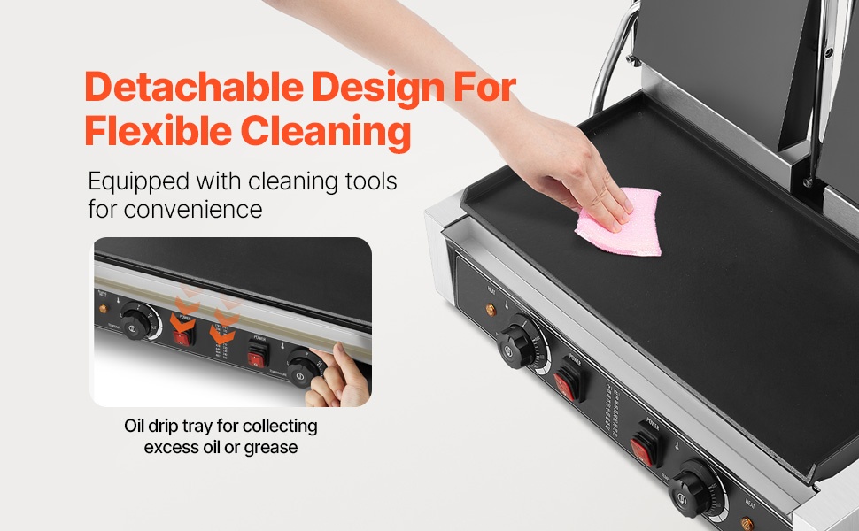 Grillin mukana tulee irrotettava rasvankeräysastia, johon paiston aikana tippuva rasva ja murut kerääntyvät. Tämä helpottaa laitteen puhtaanapitoa ja vähentää työtason likaantumista. Tasainen emaloitu paistopinta on suunniteltu niin, että se on helppo pyyhkiä käytön jälkeen.