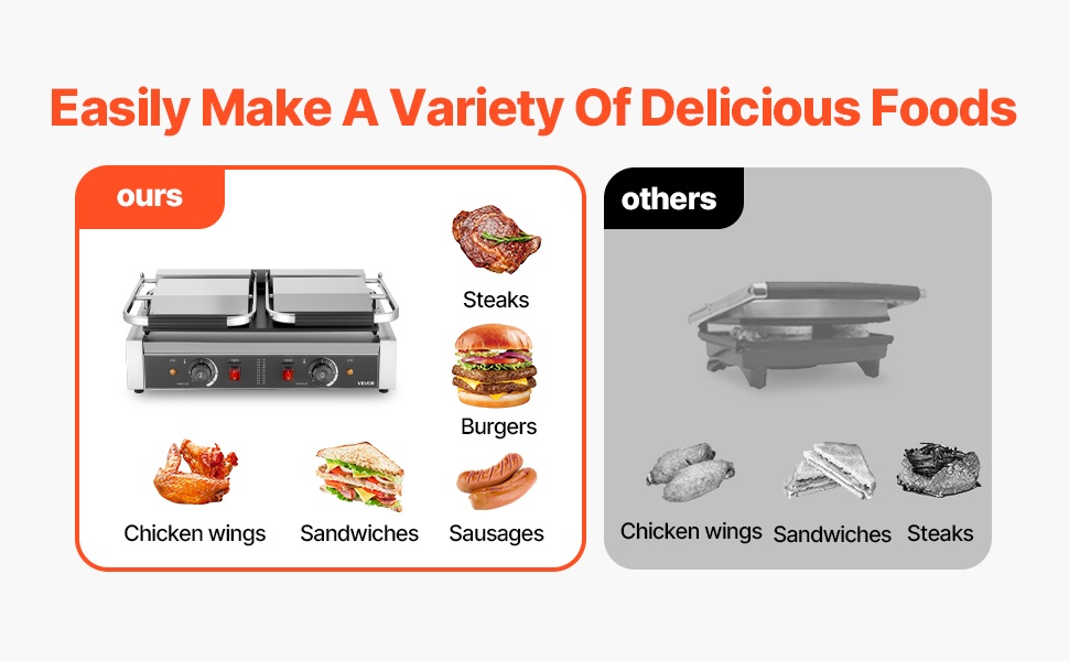 Grilli soveltuu useiden erilaisten ruokien samanaikaiseen valmistukseen. Voit valmistaa sillä esimerkiksi panini-voileipiä, hampurilaisia, vihanneksia, pekonia, kananrintaa, munaruokia ja pihvejä. Kompakti laite mahtuu hyvin työtasolle, mutta paistopinta on silti riittävän suuri useamman annoksen paistamiseen kerralla.
