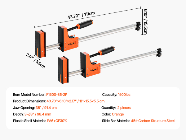 Paralleelipuristinsarja puu- ja metallitöihin 91,4 cm 680 kg 2 kpl oranssi PA6+GF30% ja hiiliteräs