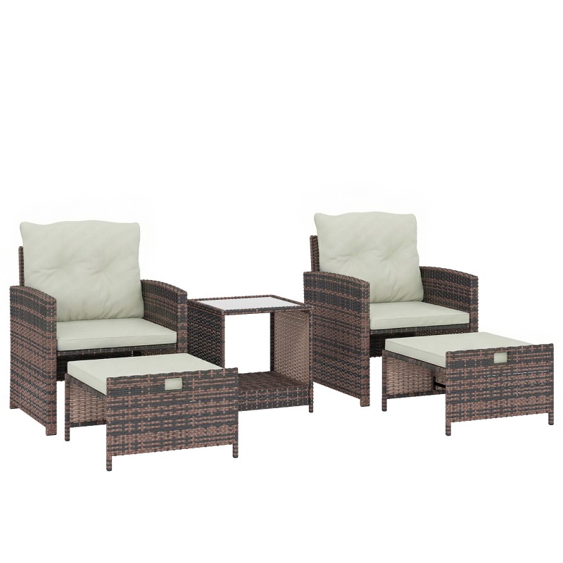 Tämä viiden osan parvekesohvaryhmä tekee pienestäkin ulkotilasta siistin ja viihtyisän. Kaksi tuolia, kaksi jakkaraa ja säilytystilallinen pöytä muodostavat käytännöllisen kokonaisuuden, jossa jakkarat liukuvat käytön jälkeen tuolien alle ja pöydän kahdelle tasolle mahtuvat käden ulottuvilla tarvittavat tavarat. Tyylikäs ruskean rottinkipinnan, kermanvalkoisten pehmusteiden ja mustien runkojen yhdistelmä sopii parvekkeelle, terassille ja puutarhaan.