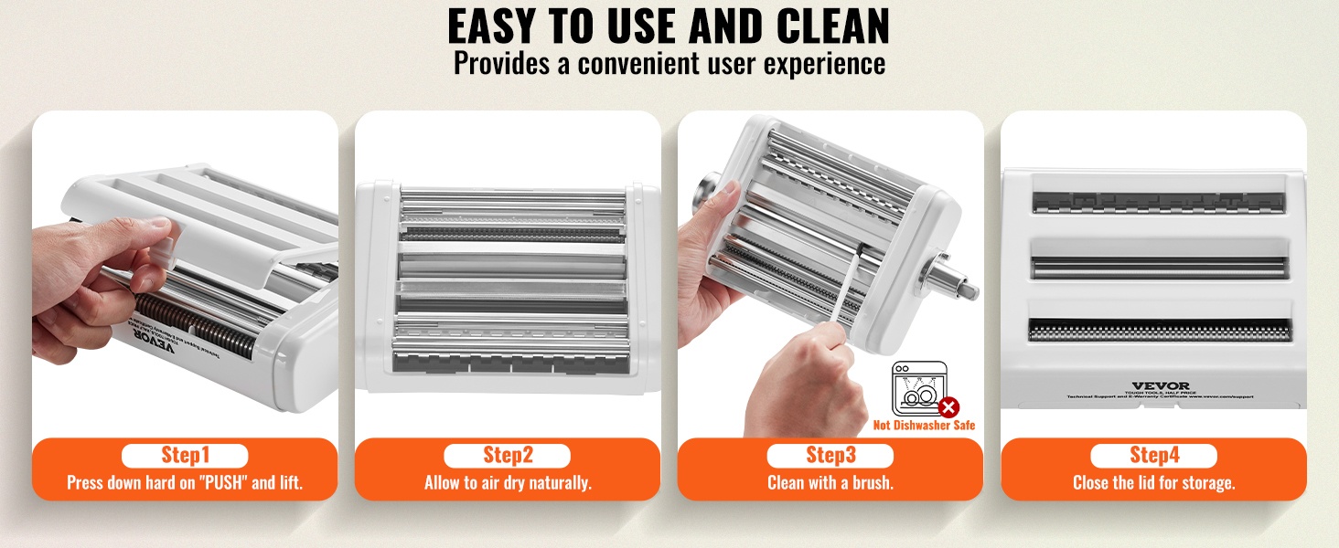 Liitä lisäosa yleiskoneeseen, säädä nuppia ja aloita pastan kauliminen ja leikkaaminen. Mukana tuleva puhdistusharja helpottaa puhdistusta. Laitteen rungon voi pyyhkiä kuivalla liinalla tai harjalla. Rullan voi huuhdella vedellä ja kuivata pehmeällä liinalla.