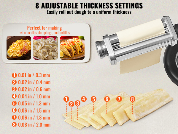 Voit säätää pastalevyjen paksuuden reseptin tai oman mieltymyksesi mukaan ja valmistaa eri paksuisia nauhoja ja levyjä. 8 eri asetusta auttavat tekemään tasapaksua taikinaa esimerkiksi leveää pastaa, nyyttejä ja tortilloja varten.