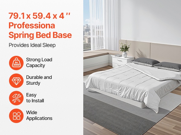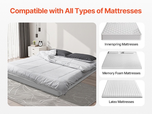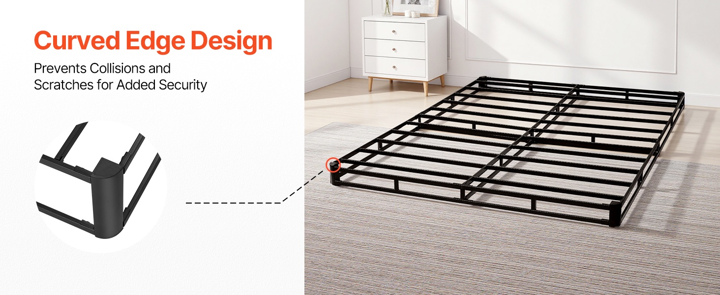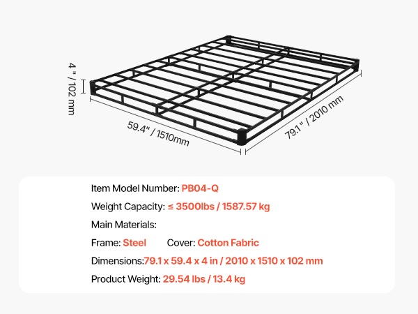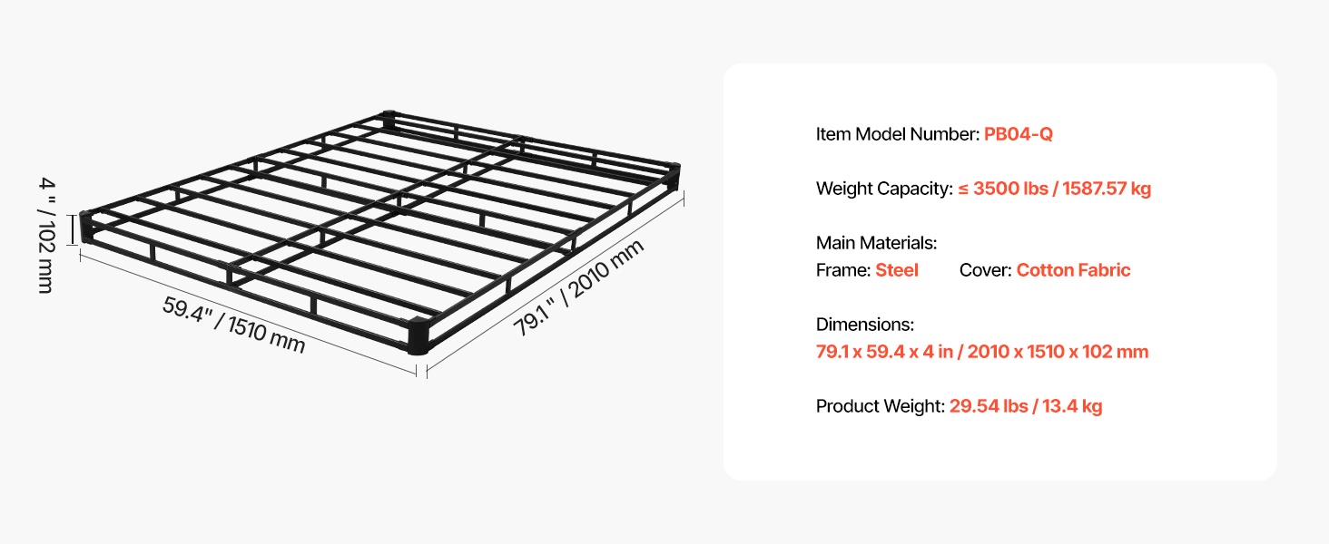 Tämä queen-kokoinen sänkyrunko toimii jämäkkänä alusrakenteena patjalle. Metallinen runko ja matala 4 in / 102 mm korkeus tarjoavat tukevan ja hiljaisen alustan, joka auttaa pidentämään patjan käyttöikää ja lisäämään nukkumismukavuutta.