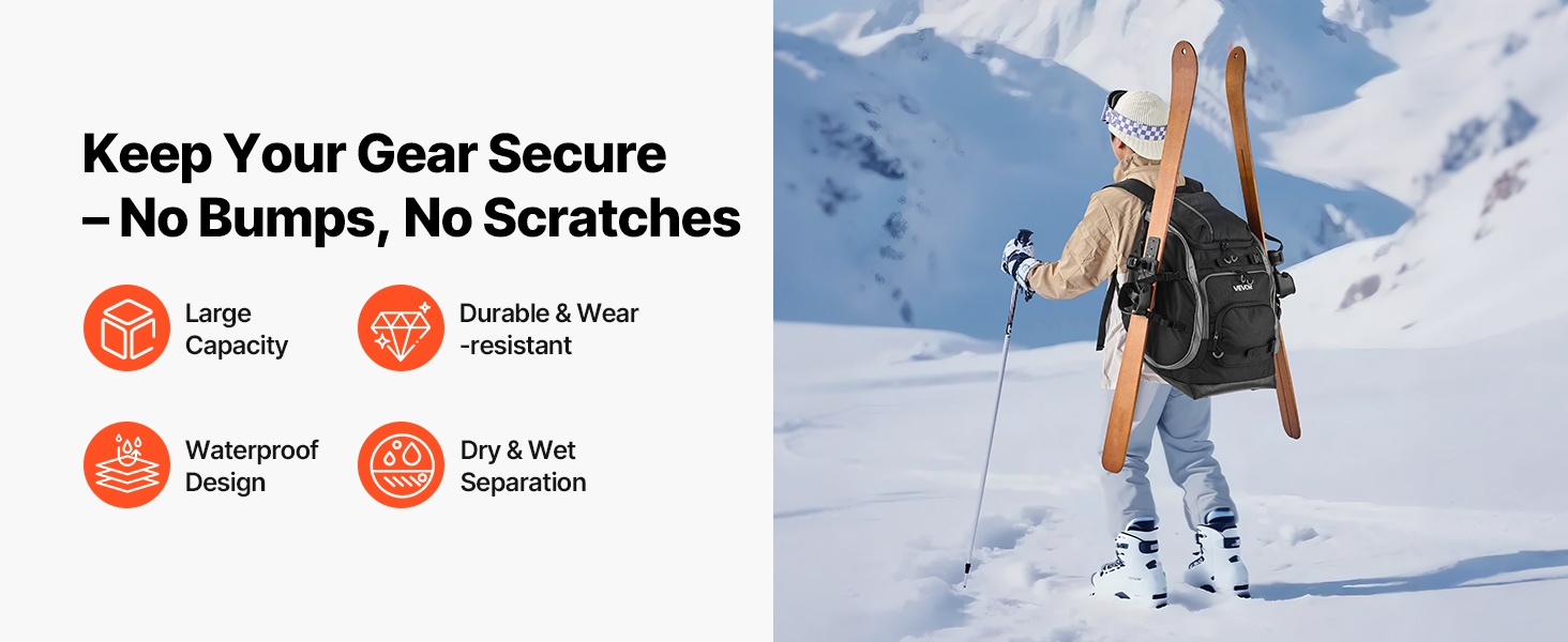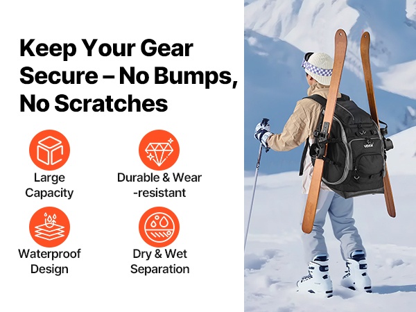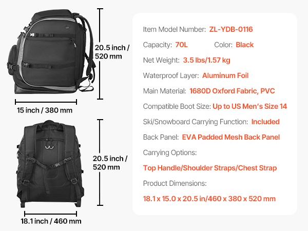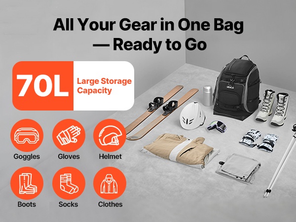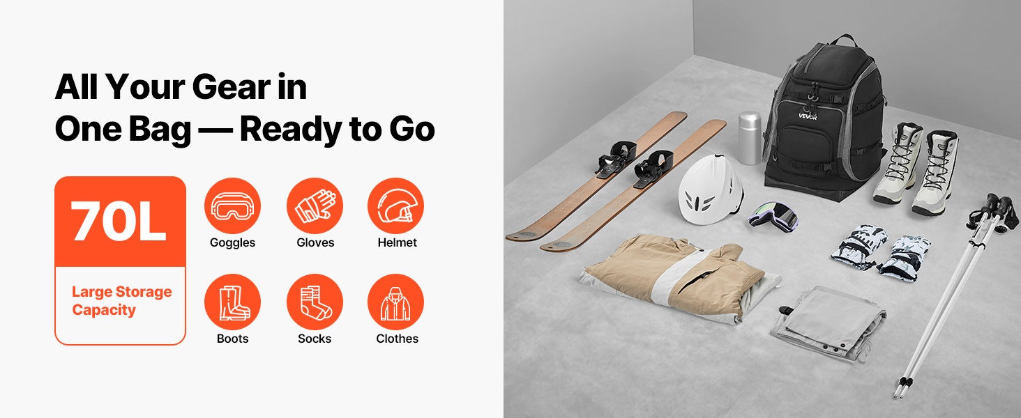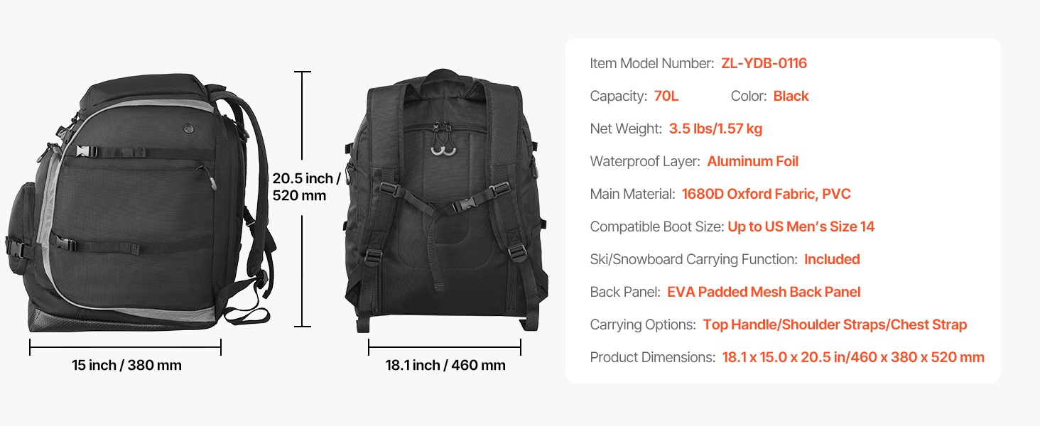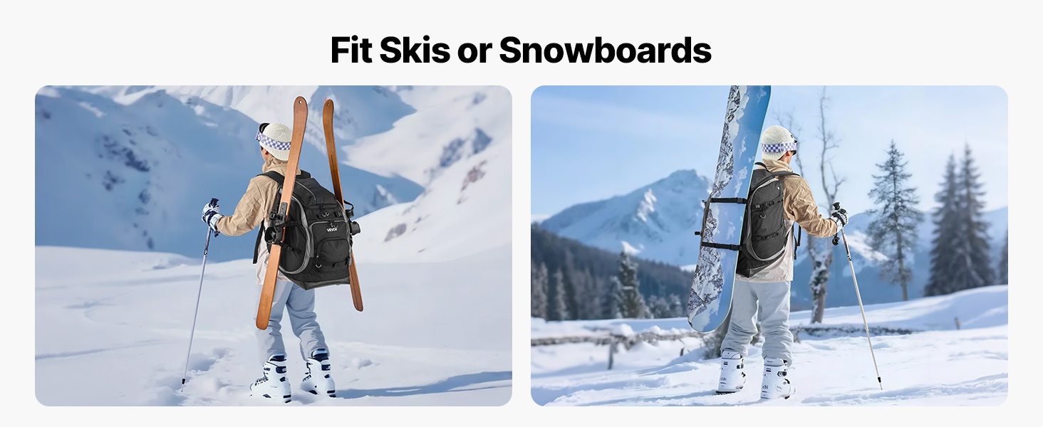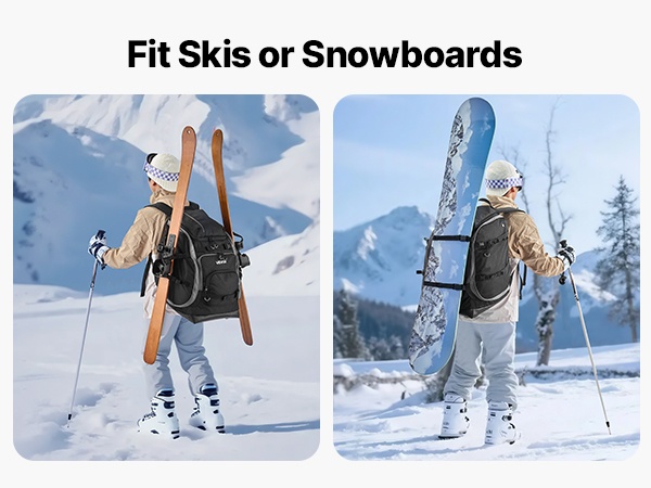 Laukkuun mahtuu lumilauta jopa pituuteen 68.9 in asti, joten se sopii useimmille yleisille lauta- ja suksipituuksille. Sisäiset säädettävät hihnat auttavat kiinnittämään sekä sukset että lumilaudan tukevasti, jotta ne eivät liu’u tai kolise kuljetuksen aikana.