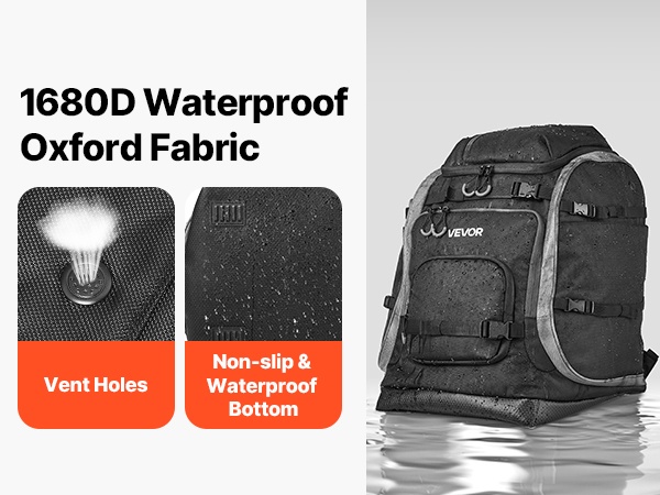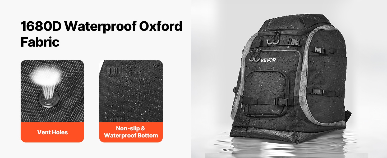 Laukku on valmistettu kevyestä 600D vedenpitävästä oxford-kankaasta, jossa on suojaava sisävuori. Materiaali pitää lumen ja sateen ulkopuolella ja auttaa ehkäisemään kosteudesta johtuvaa ruostumista ja varusteiden vaurioitumista. Samalla rakenne pysyy kevyenä kantaa.