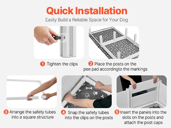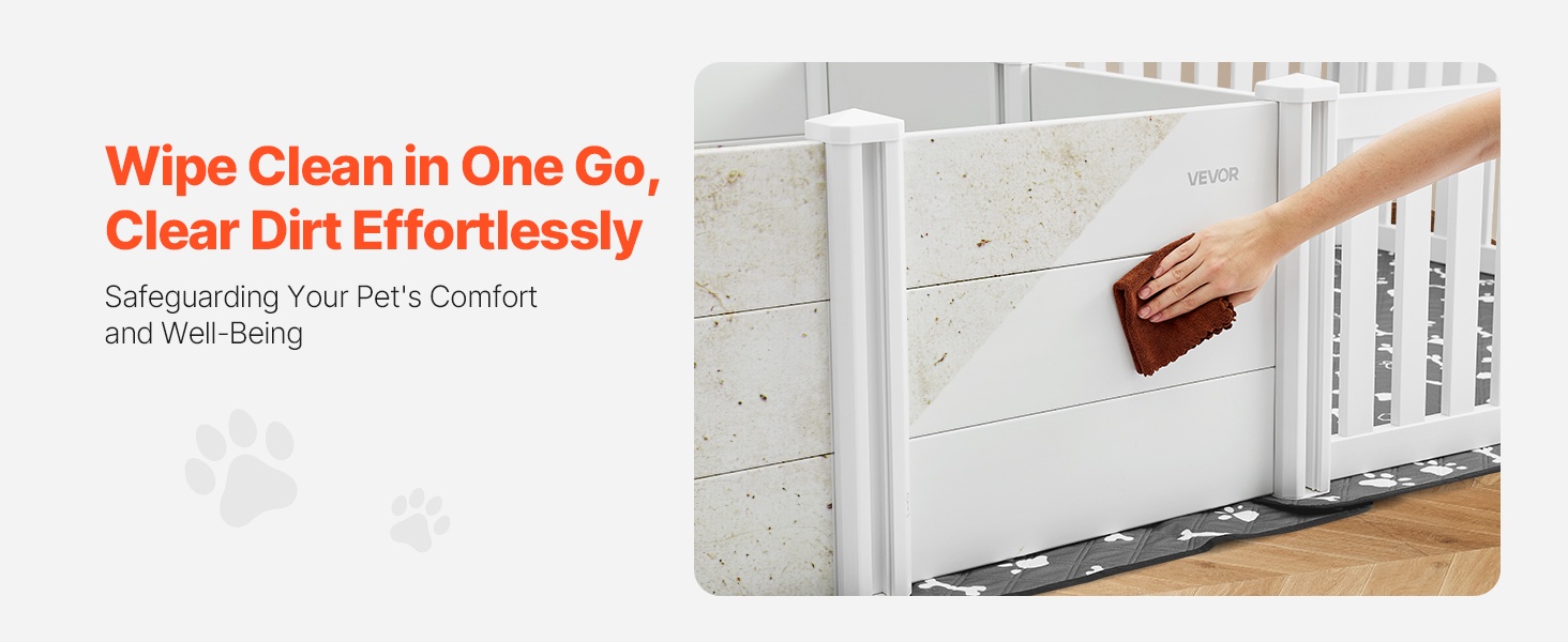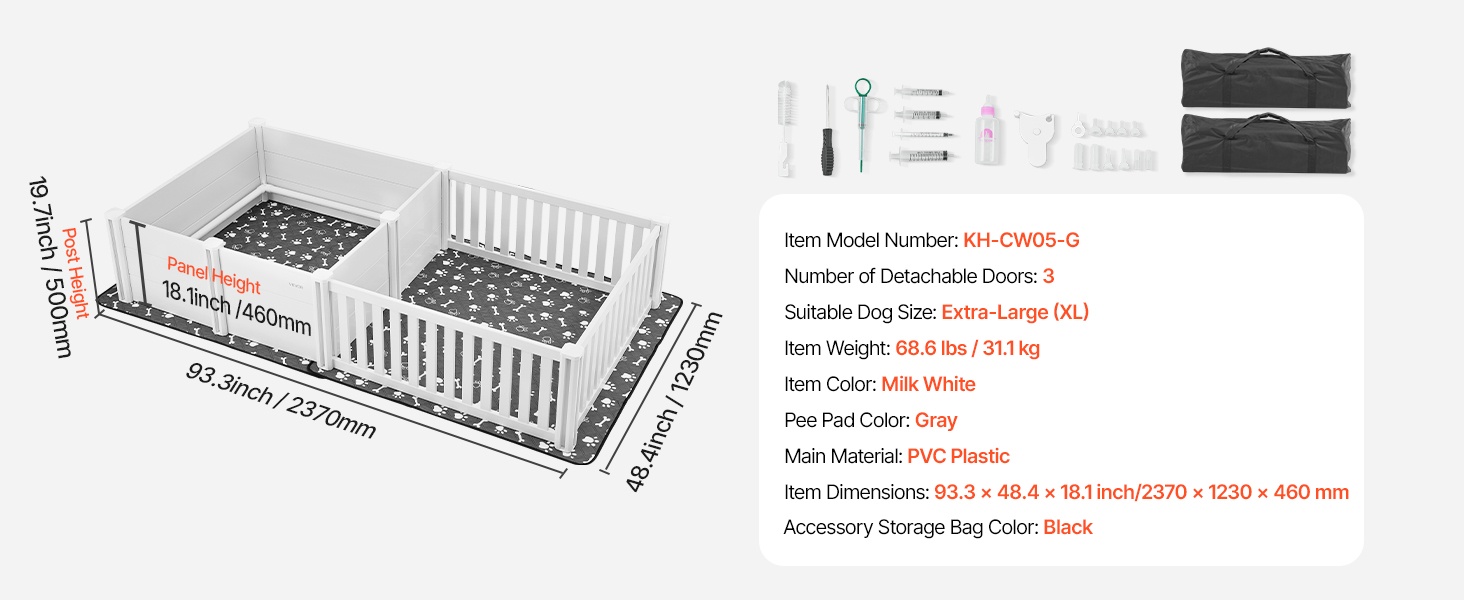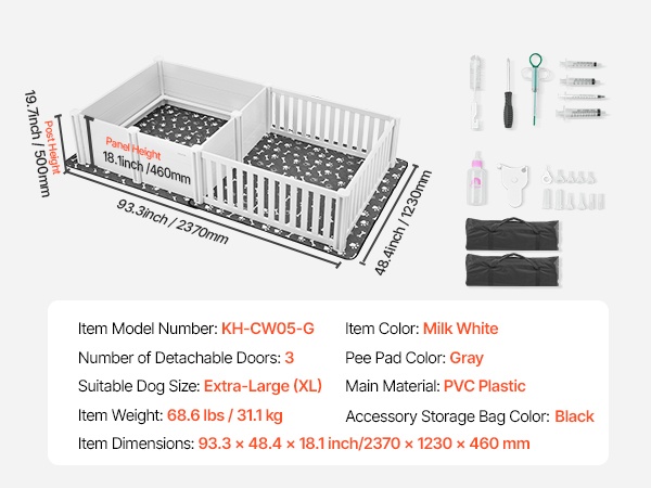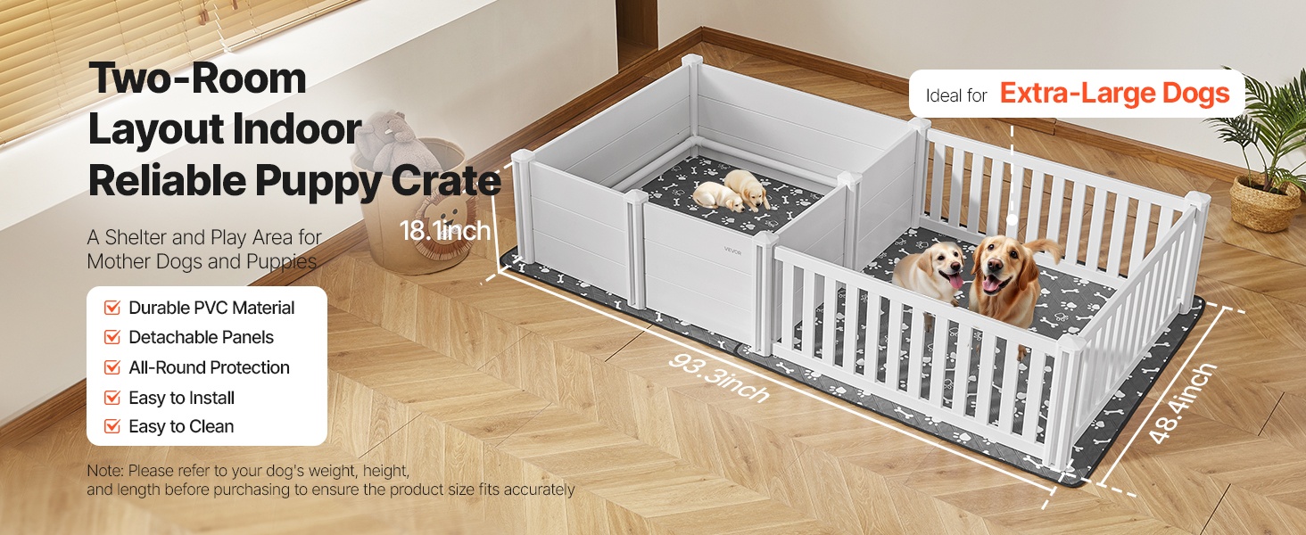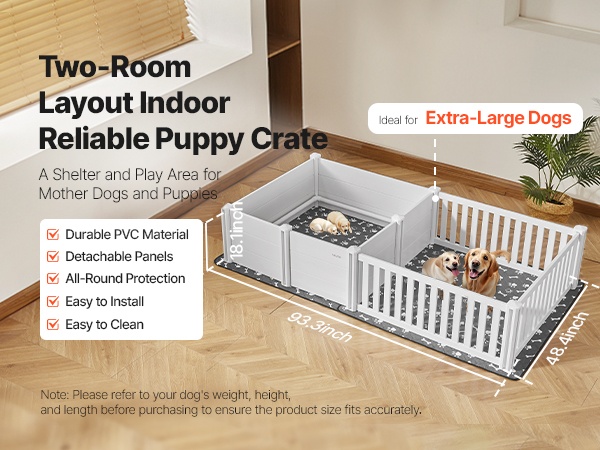 93.3x48.4x18.1 inch / 2370x1230x460 mm pentulaatikko kahdella huoneella ja pestävällä pissatyynyllä. Kestävästä, vedenpitävästä PVC-muovista valmistettu laatikko on helppo puhdistaa ja sopii erittäin suurille koiraroduille. Kaksi säädettävää ovea mukautuvat pentujen kasvuun. Selkeät nuolet helpottavat kokoamista. Varmista koirasi koko ennen ostoa.