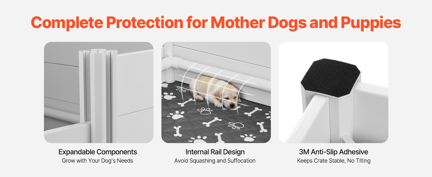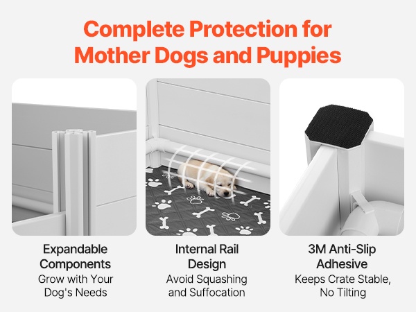 Sisäänrakennetut kaiteet auttavat ehkäisemään tilanteita, joissa emot voisivat vahingossa litistää pentuja. Pohjassa olevat 3M-liukuesteet pitävät seinät tukevasti paikoillaan. Lisäpaneeleilla tilaa voidaan laajentaa koiran kasvaessa.