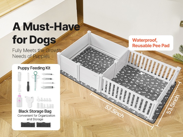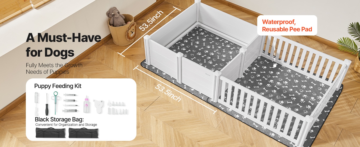 Pakkaukseen kuuluu 53.5x53.5 in / 1360x1360 mm vedenpitävä, uudelleenkäytettävä pissatyyny, ruokintasarja pentujen kasvun tukemiseen sekä musta säilytyspussi osien järjestyksessä pitämistä ja kuljettamista varten.