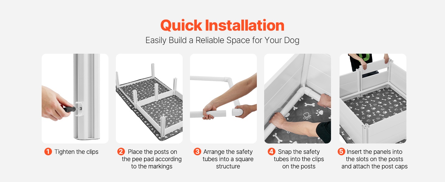 Muovinen koira-aitaus napsautetaan paikalleen esiporattujen reikien ja lasermerkittyjen nuolien avulla. Kokoaminen onnistuu ilman työkaluja ja ilman monimutkaisia ohjeita.