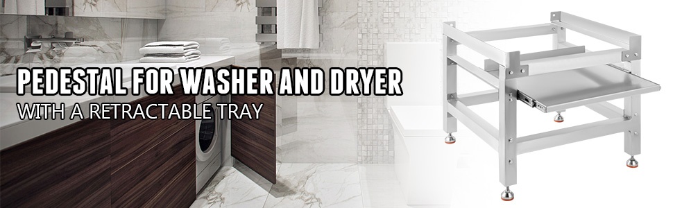 Pesukoneen ja kuivausrummun jalusta alumiiniseoksesta ulosvedettävällä tarjottimella säädettävillä jaloilla
